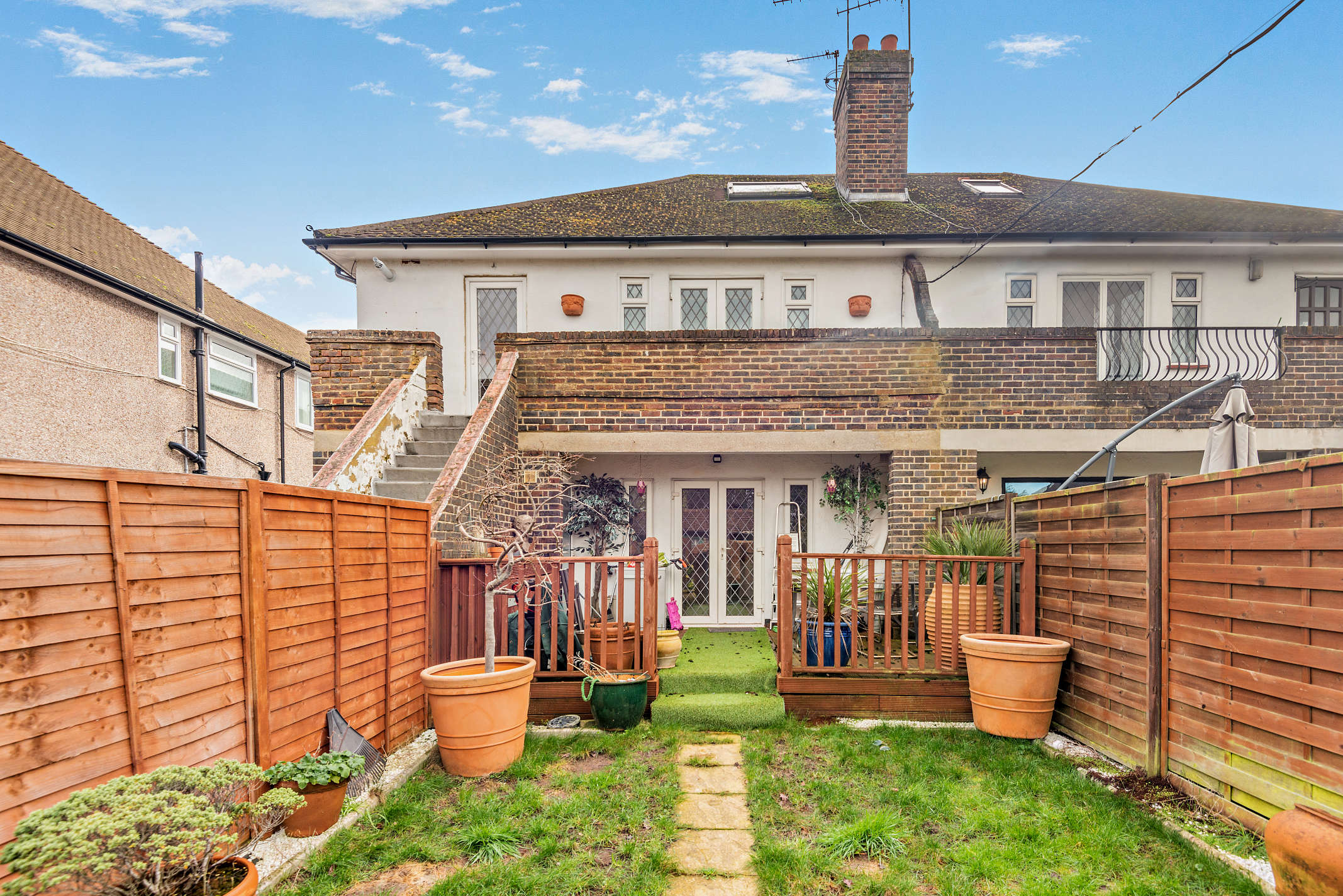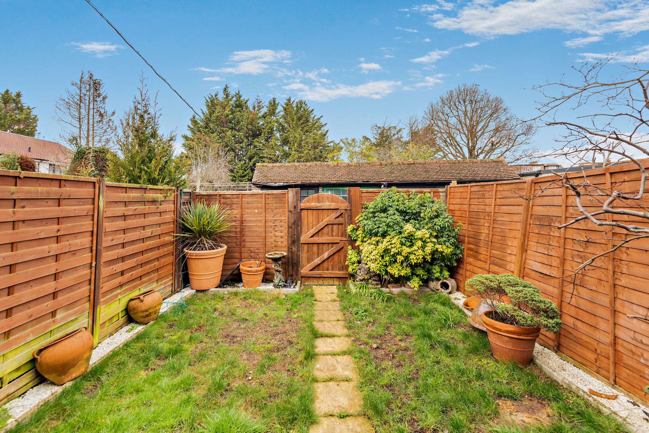The property is approached via a front garden with shrubs and a paved path to the entrance. The enclosed rear garden features a raised decked terrace, lawn with a paved path to a rear gate, and borders with decorative shingle and shrubs.