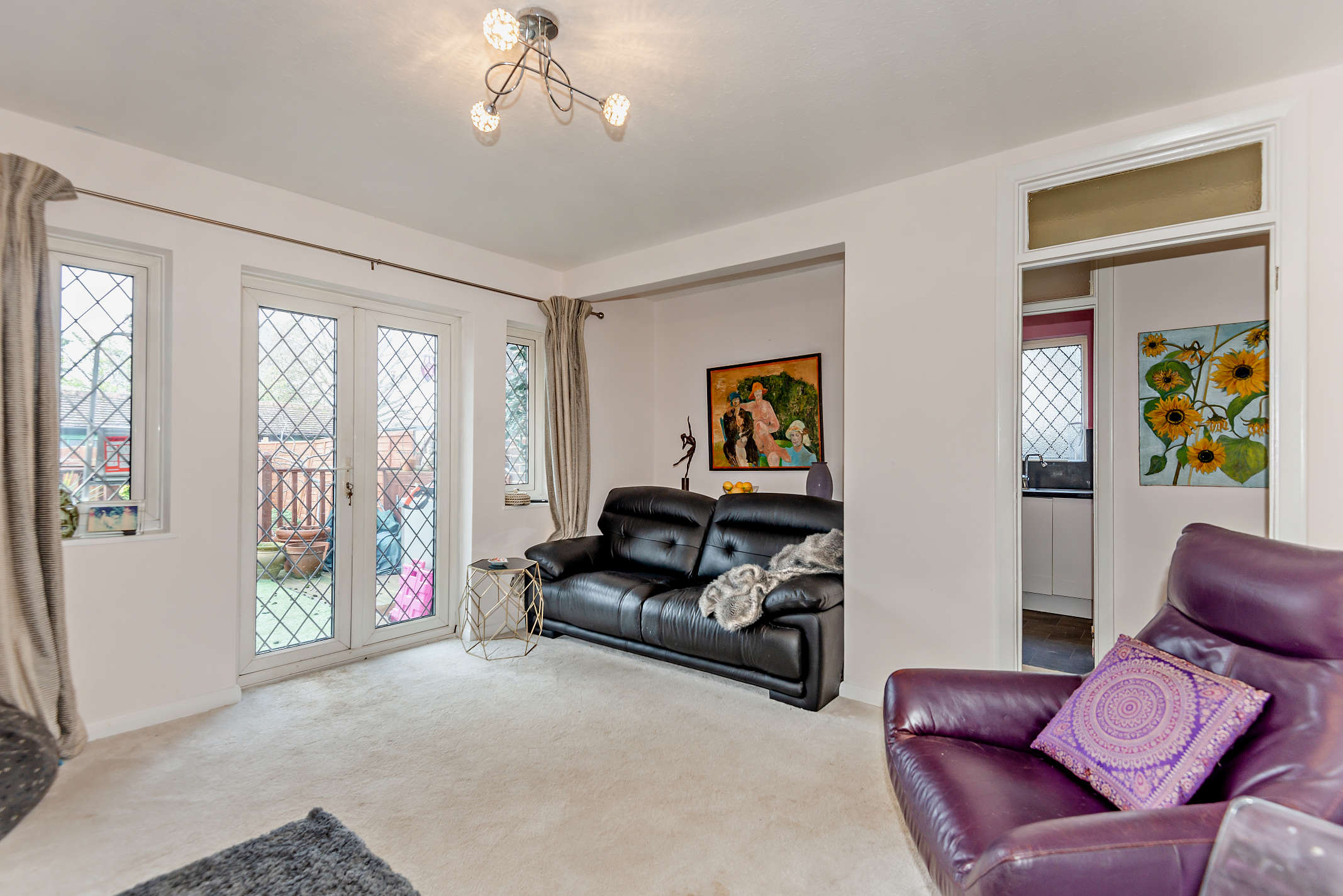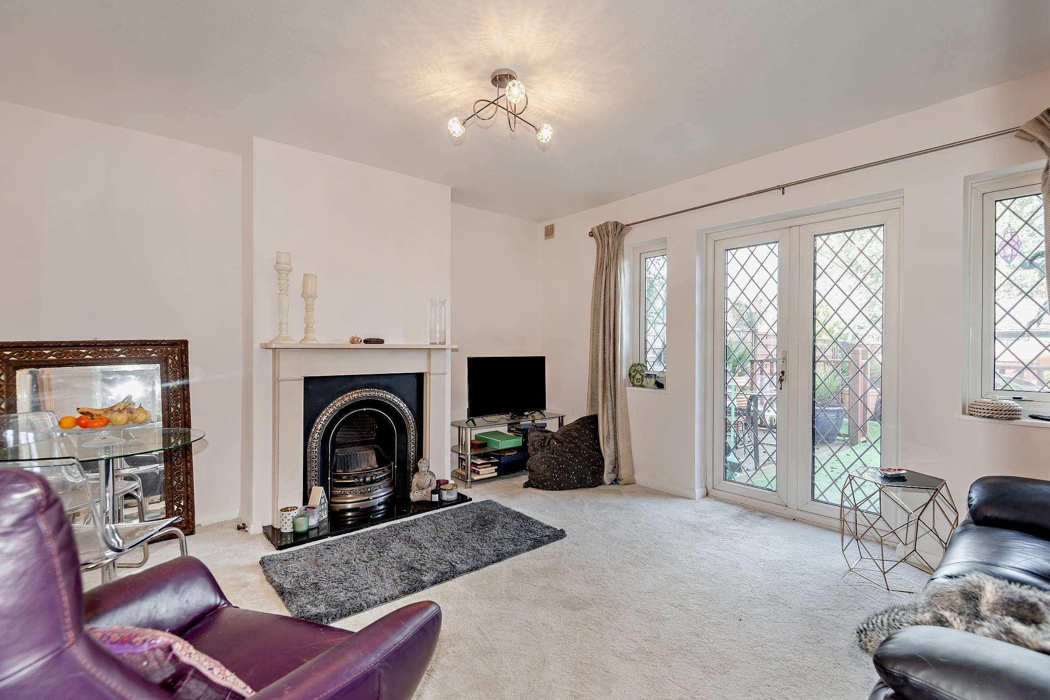 This is a spacious reception with a feature fireplace, carpeted flooring and views via French windows over the garden.