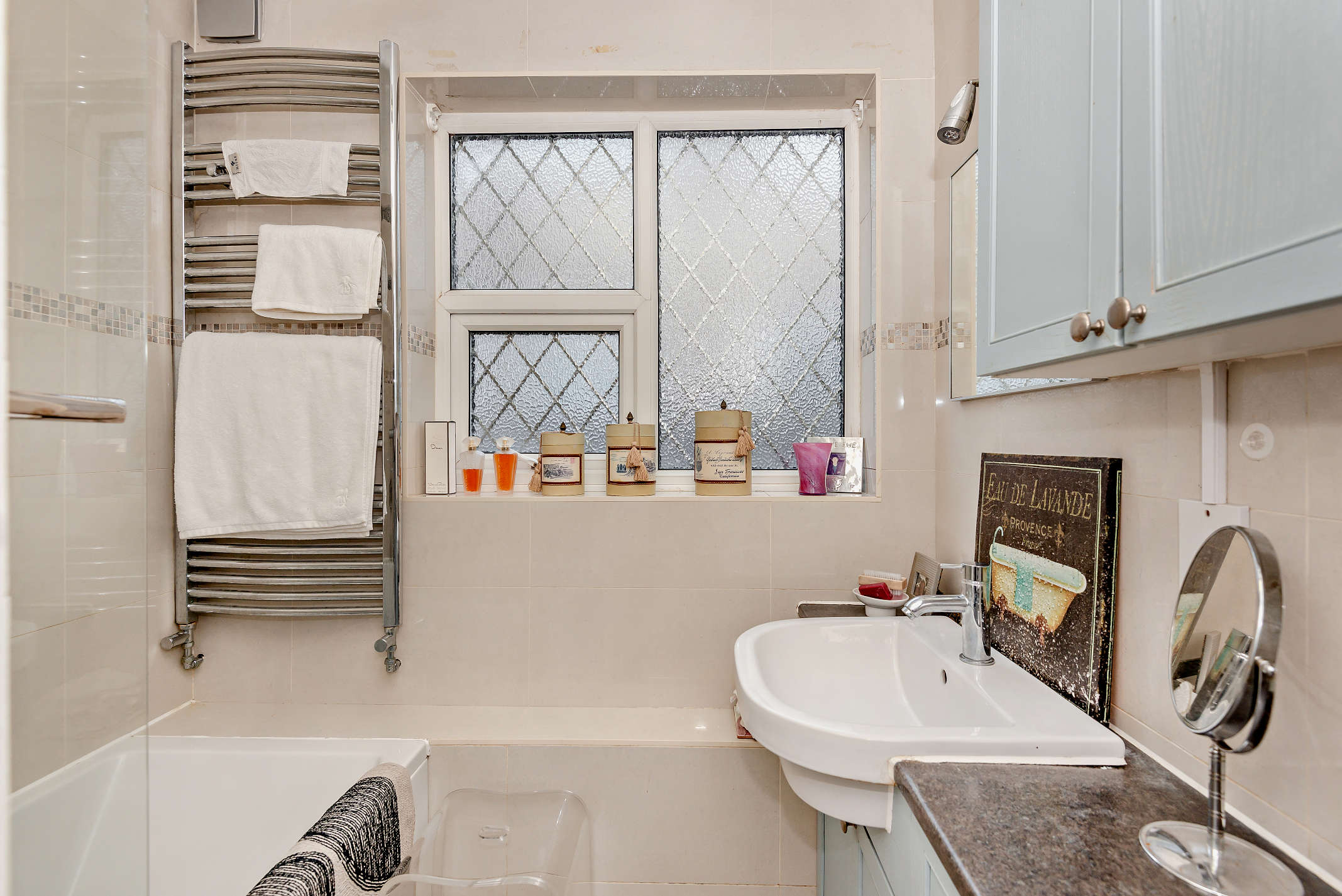 The bathroom includes a white bath with shower and screen, a washbasin, and a chrome ladder radiator.