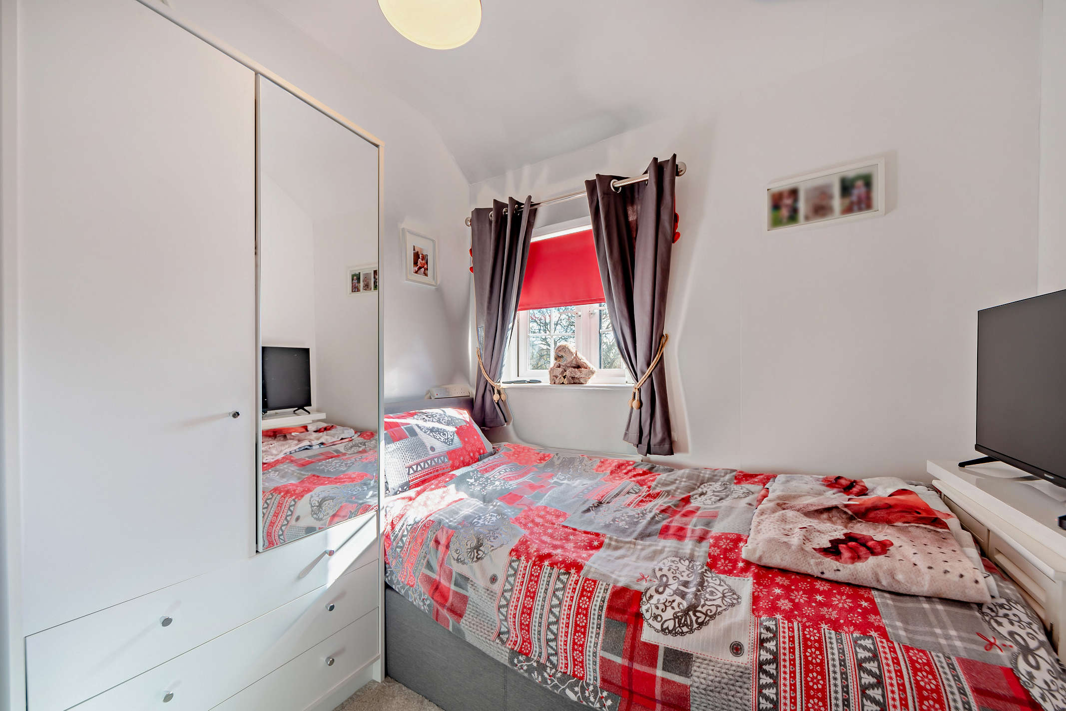 This is a spacious double bedroom with neutral décor, in-built storage, carpeted flooring and a front aspect view.