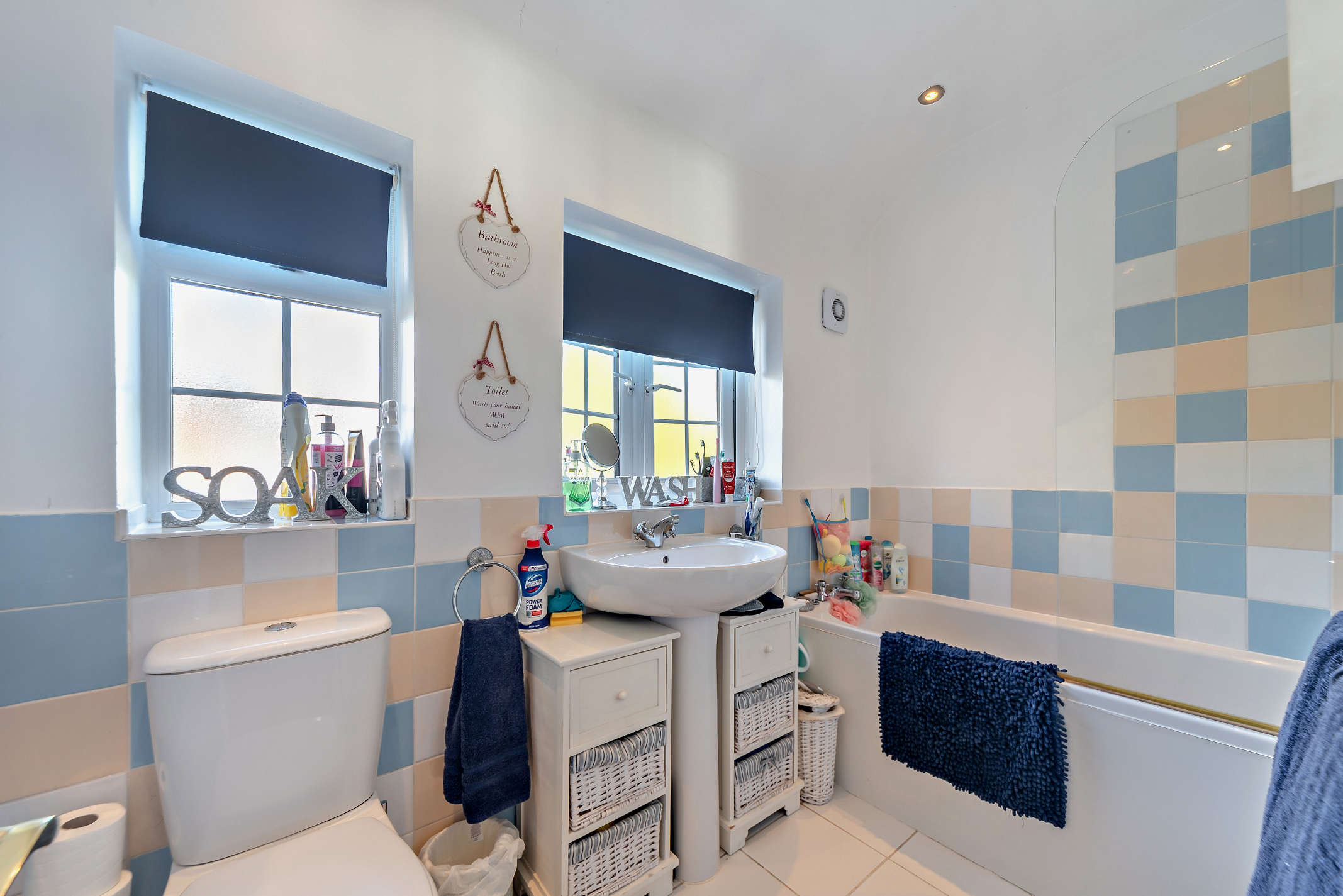 The part-tiled bathroom offers a white three-piece bathroom suite with electric shower and screen over the bath. On the landing, opposite the bathroom, there is in-built storage.