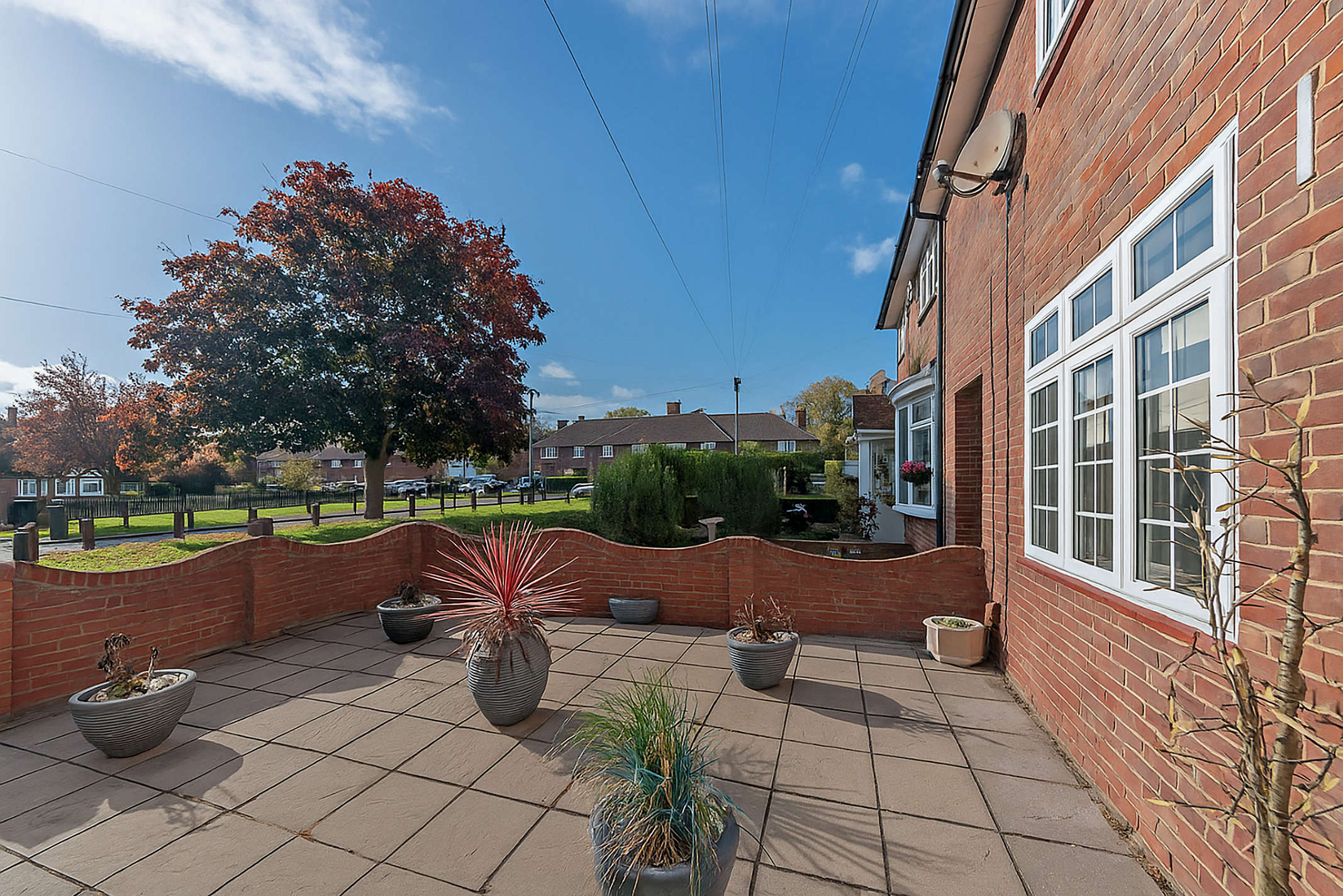 The property is approached via an enclosed front garden with a gate and paved frontage, offering views over greensward and mature trees. The rear garden features a sleeper-bordered lawn, decked terrace, summer house, storage shed, and a paved patio for al fresco dining, with a side gate providing pedestrian access to the front.