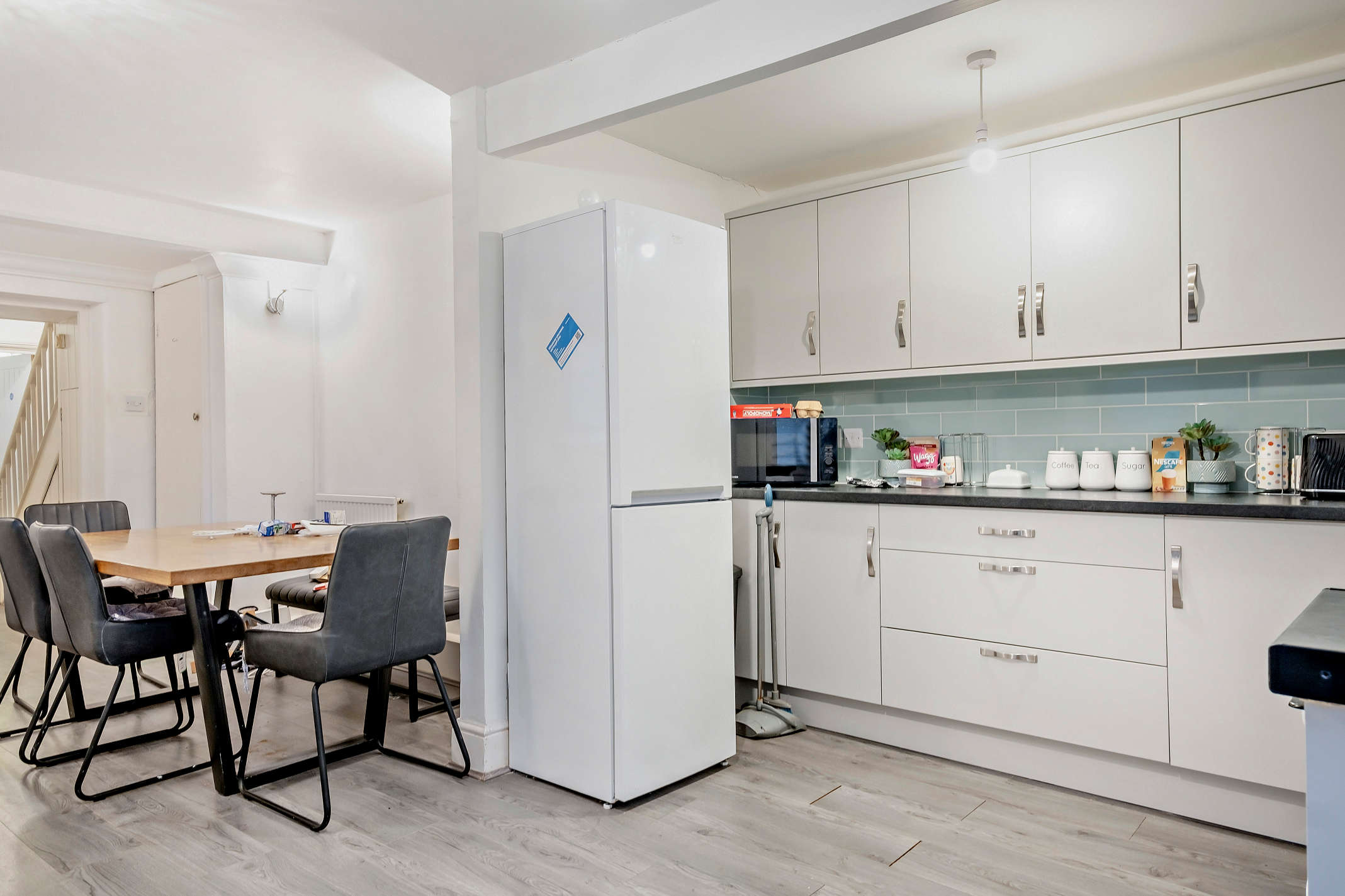 The modern kitchen flows seamlessly from the breakfast room. It is fitted with white storage cupboards and an extrctor fan.