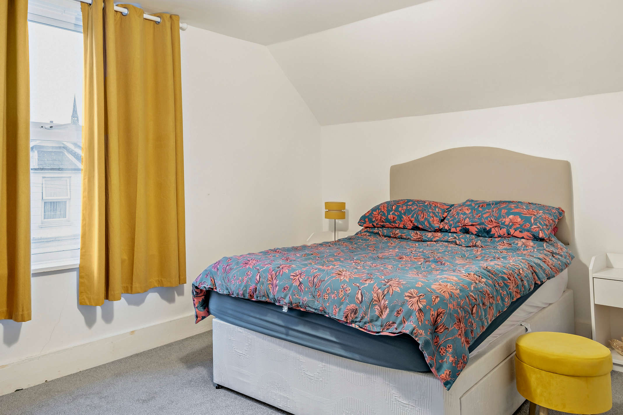 This first floor double bedroom features a front aspect three-panel bay window, built-in storage space, and carpeted flooring.