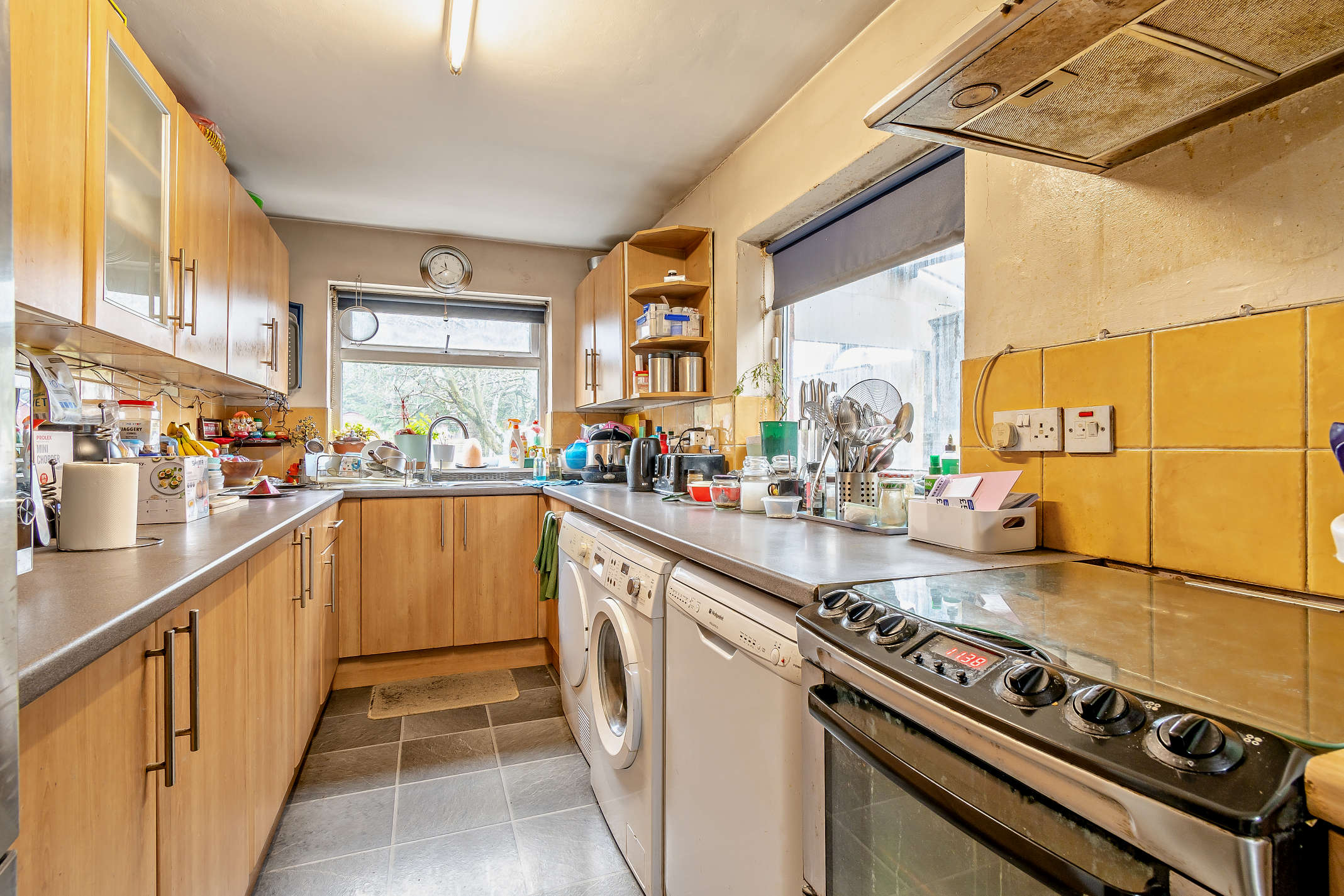 The double aspect kitchen fully-fitted with storage cupboards, a stove and an extractor hood.