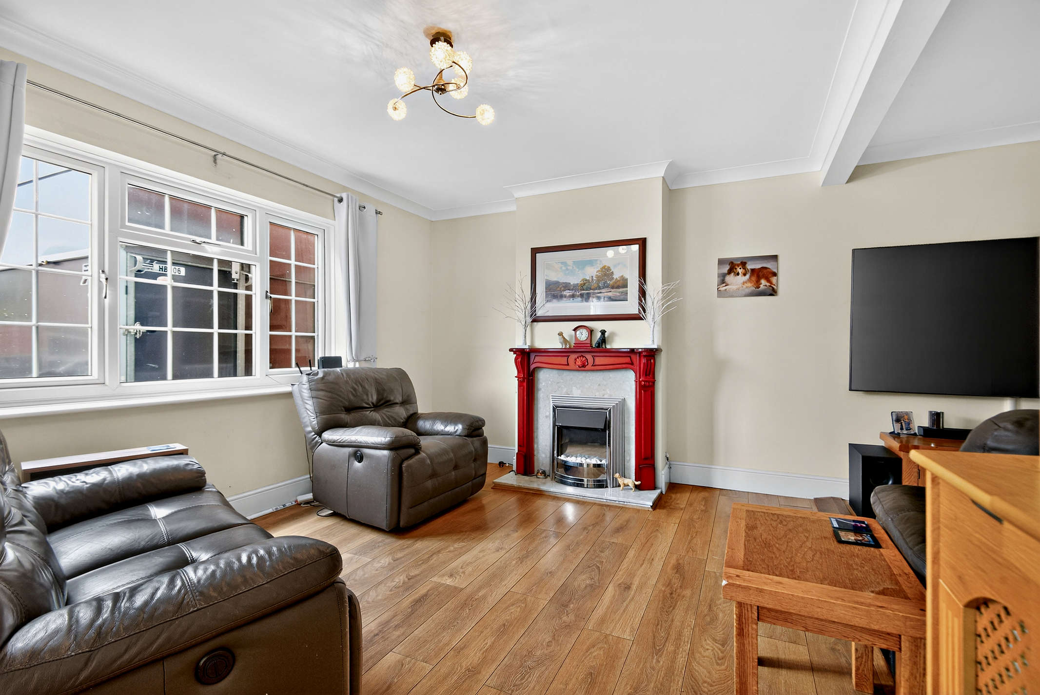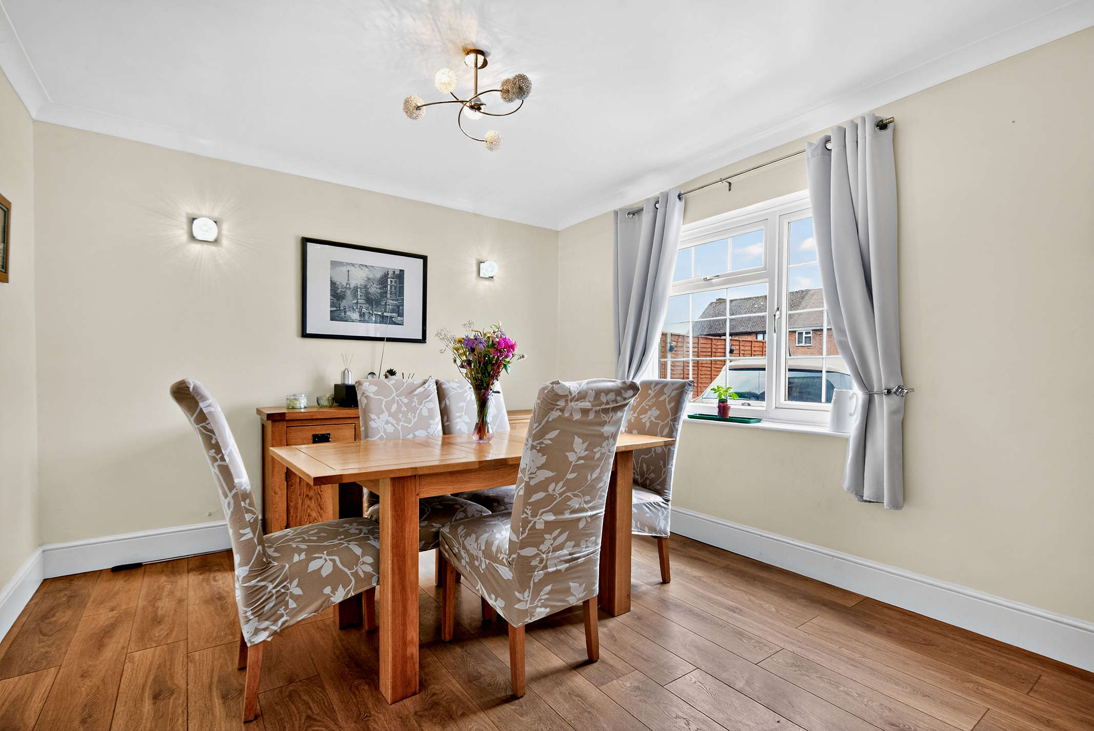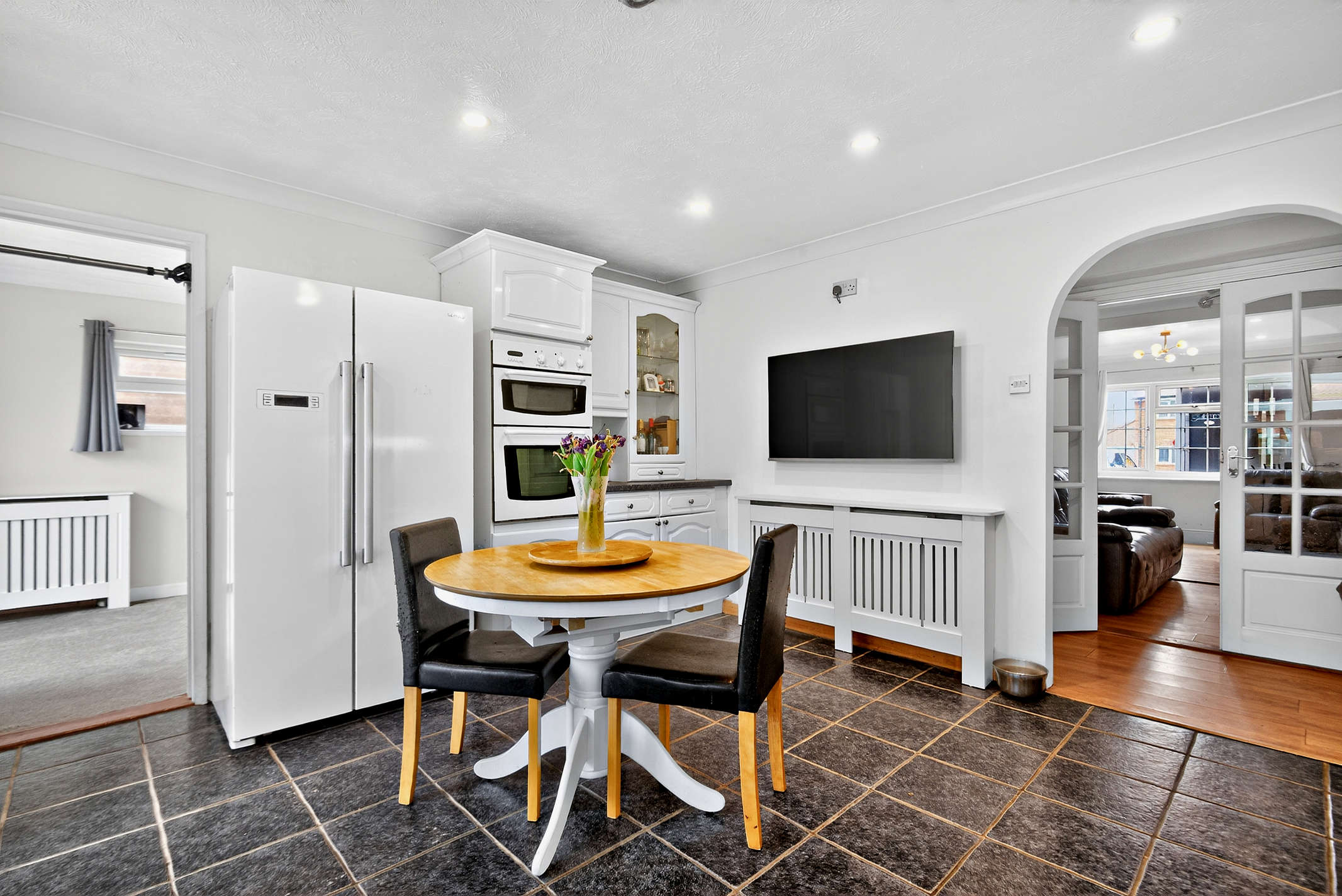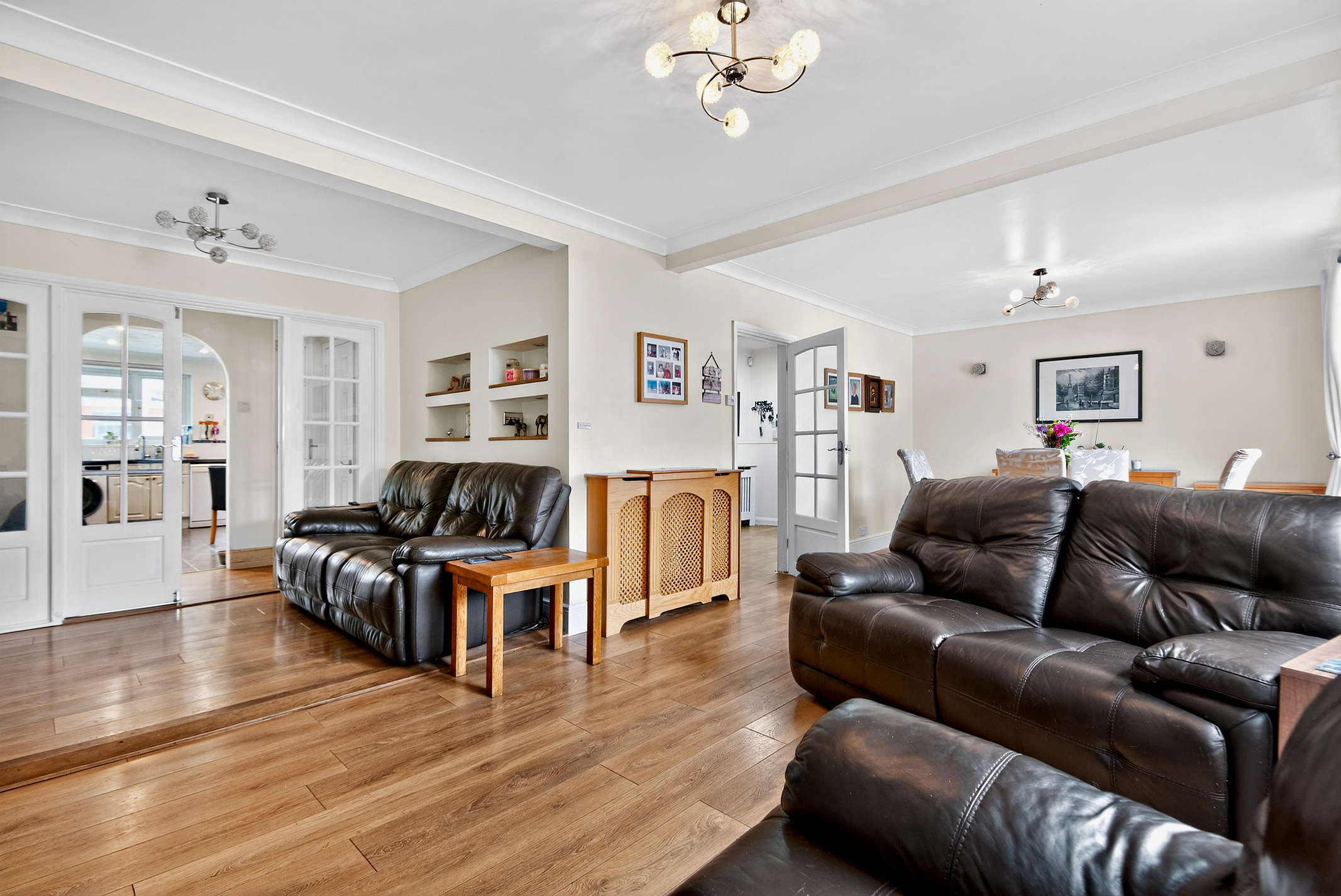 The spacious L-shaped drawing room/diner boasts a built-in fireplace, windows with front views and laminated flooring. From here double cottage style doors with side windows opens up to a vestibule that seamlessly connects with the kitchen.