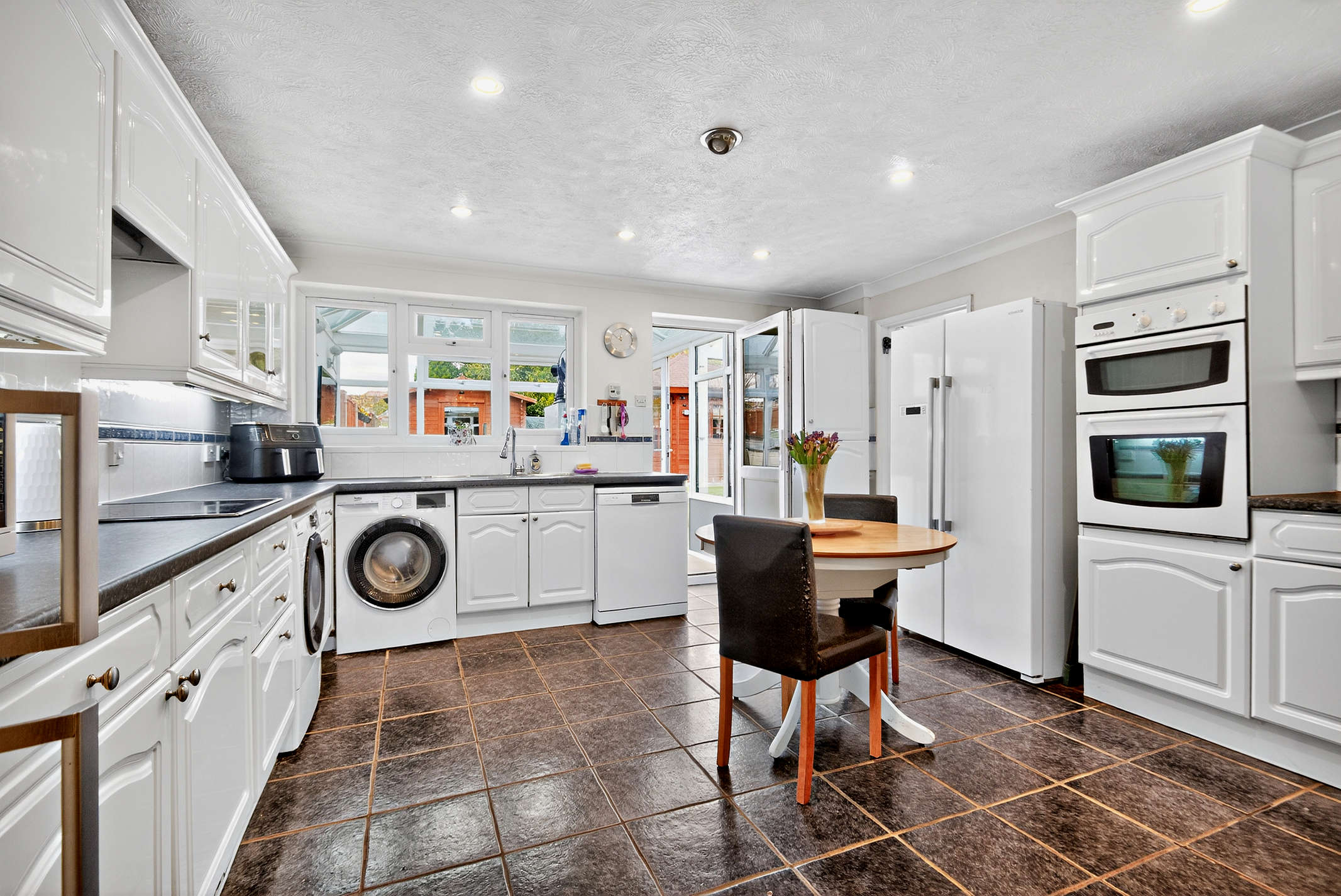 The kitchen is fitted with storage cupboards and built-in utilities, including a double eye level oven and hob. More features include a window with internal views, and a door that leads to the conservatory.