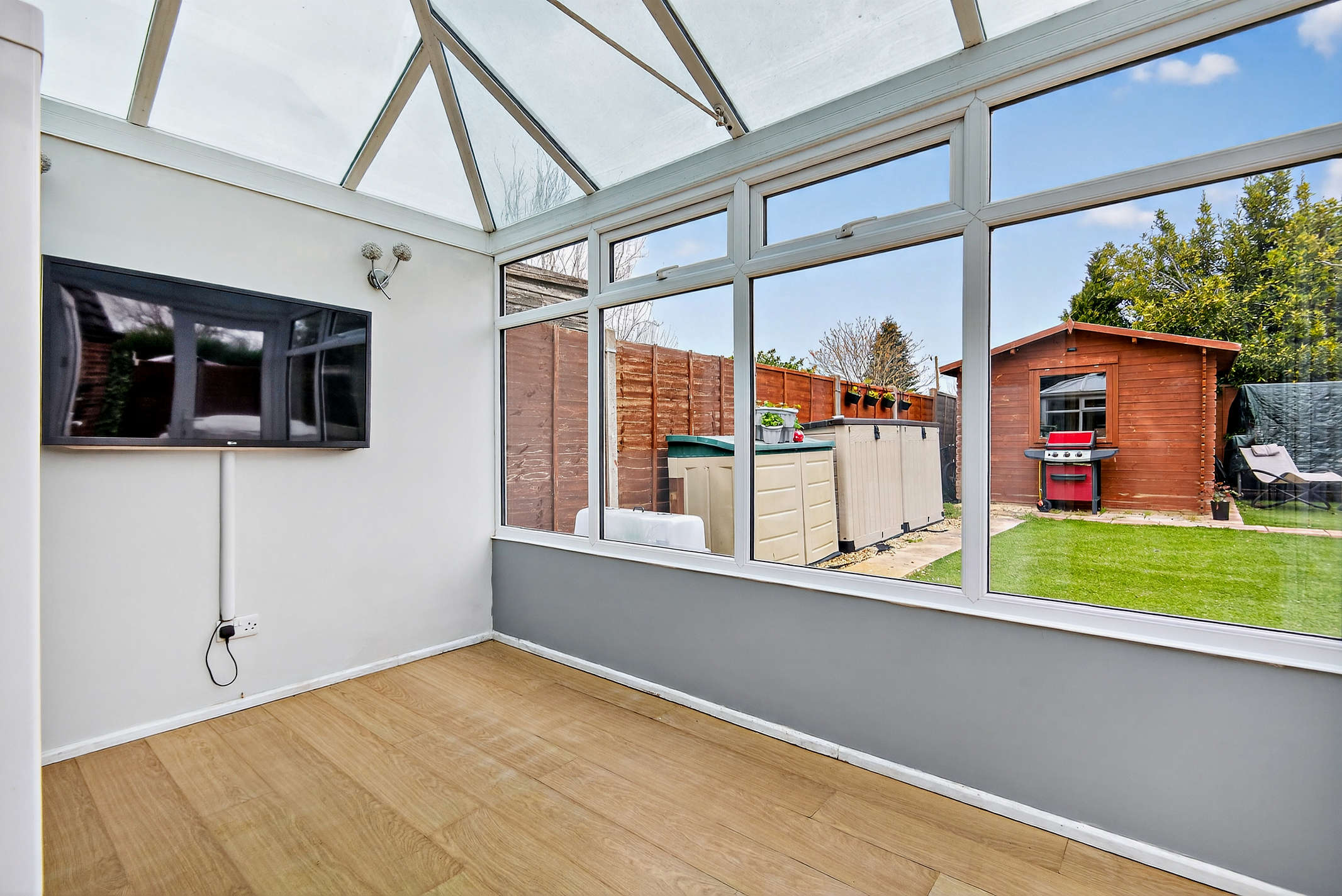 The conservatory boasts transparent roofing, large windows with rear views, laminated flooring and a side window that opens up onto a paved patio and back garden.