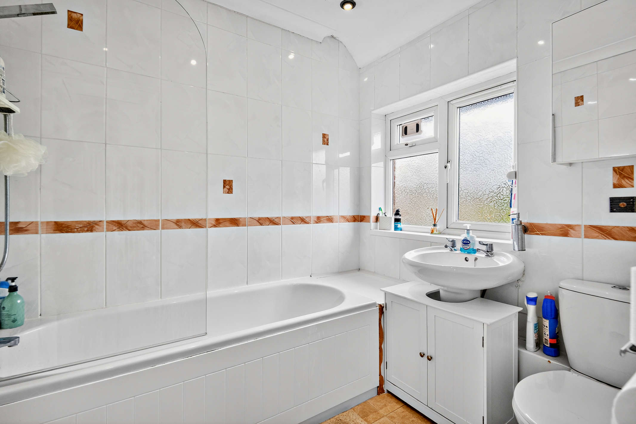 The bathroom is equipped with toilet, wash-hand basin in cabinet, and bath facilities.
