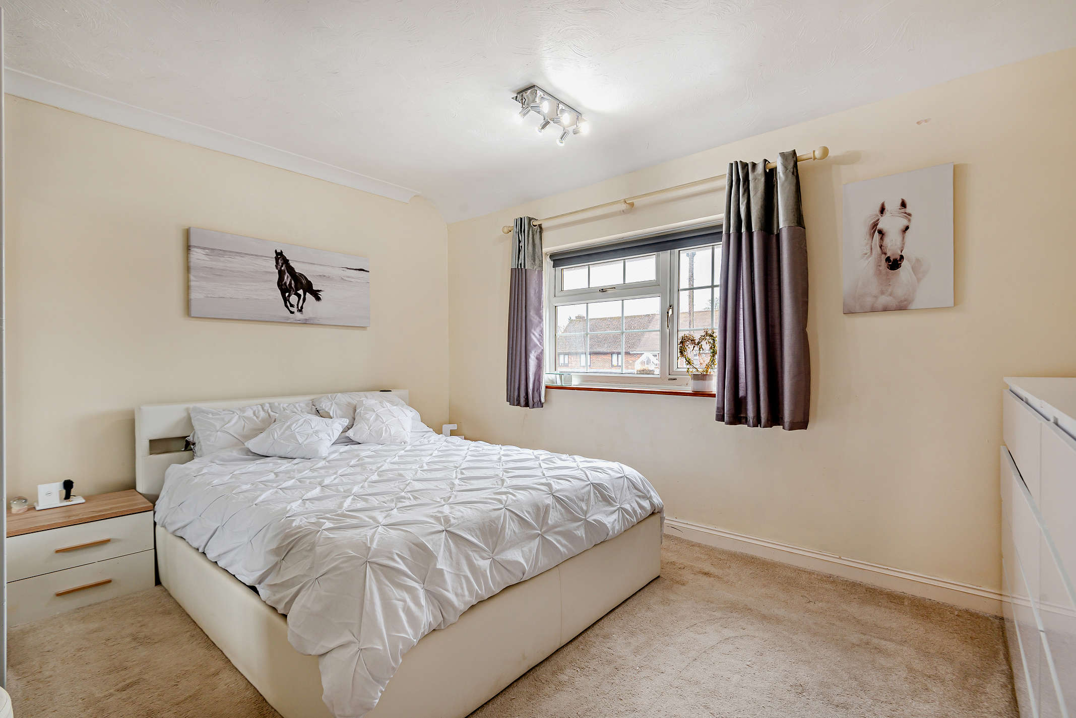 Bedroom one is a double offering a window with front views and carpeted flooring.