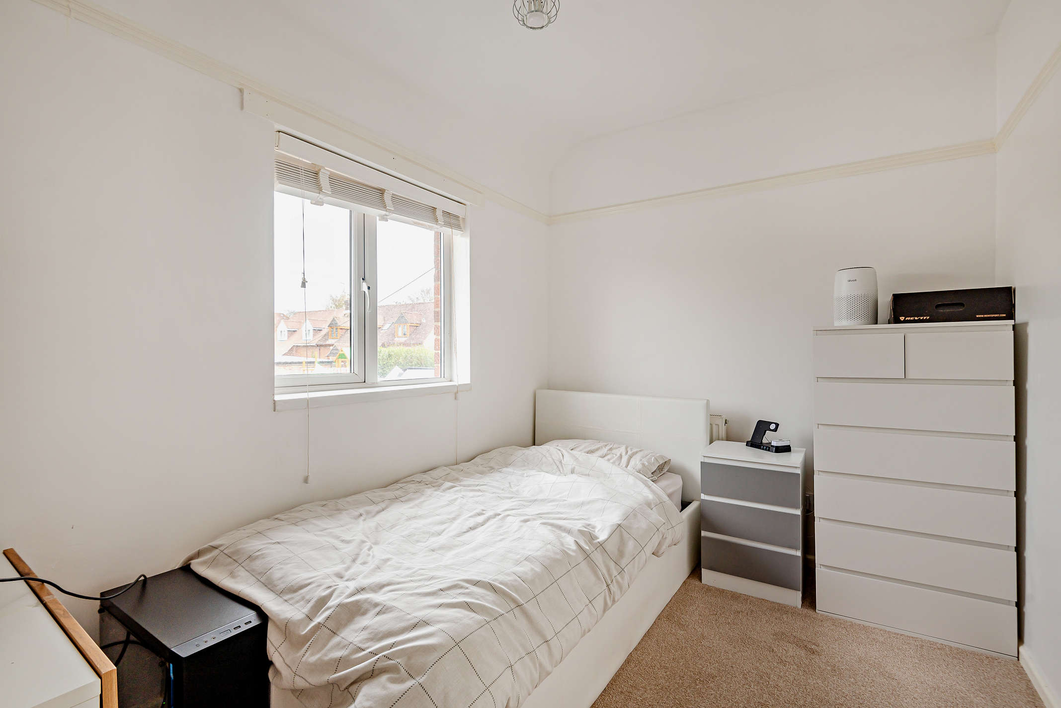 Bedroom three is snug single with features such as a window with rear views carpeted flooring.