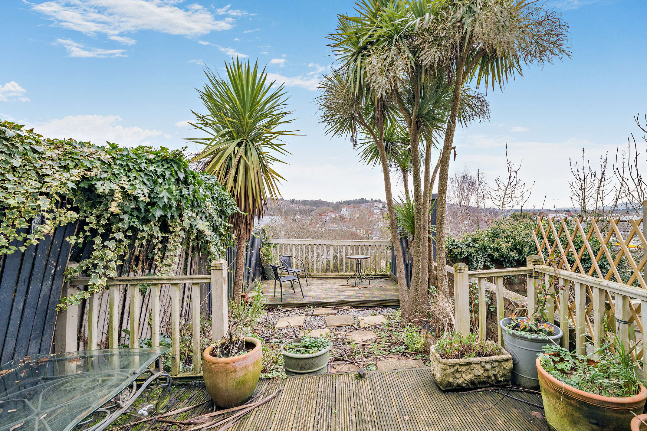 Front access is directly off the street. The enclosed rear garden features block paving, raised wooden decks, shrubbery, pot plants, and exotic trees, with a leisure area offering splendid views.