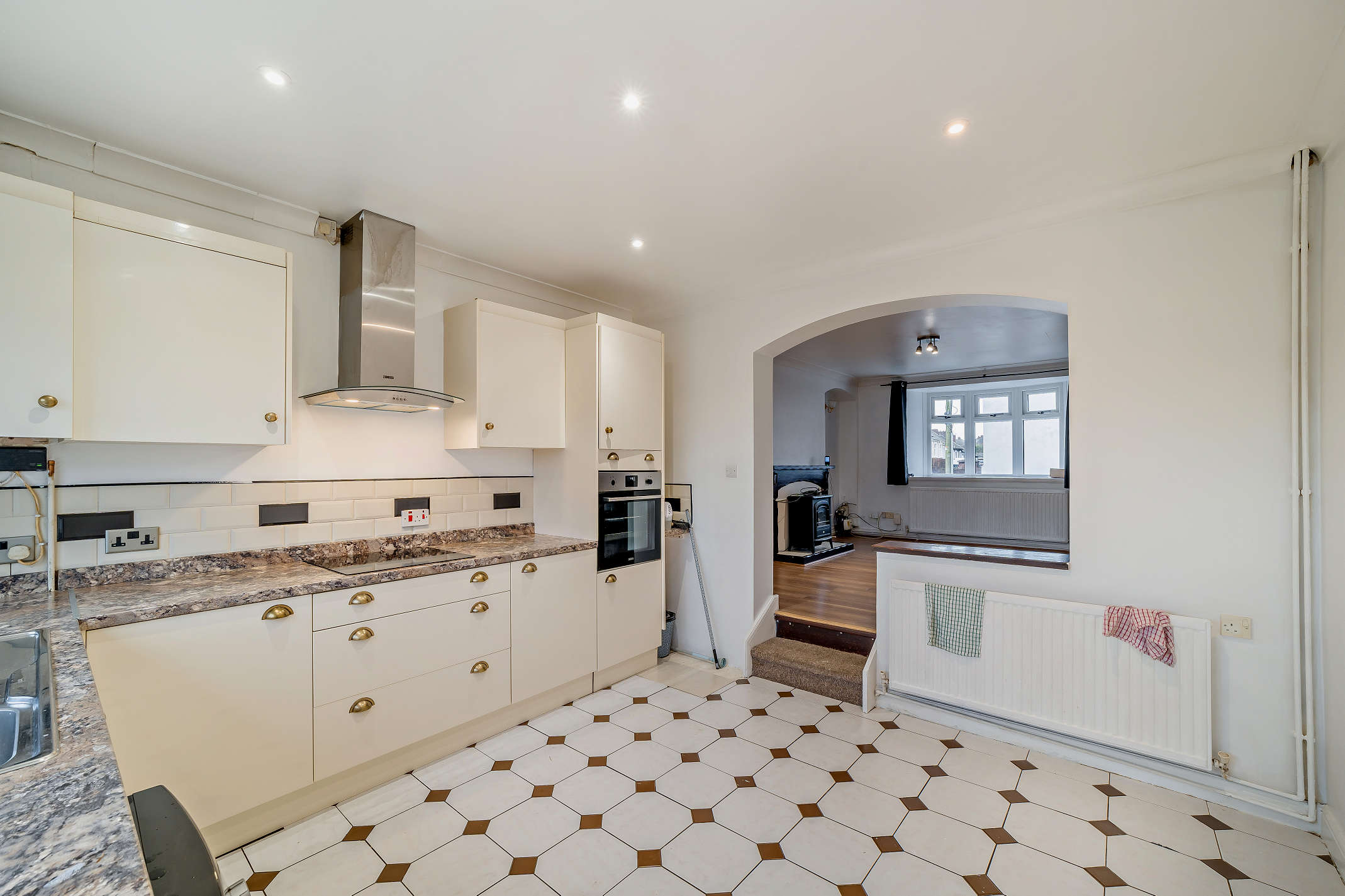 Fitted with cupboards and built-in utilities including an eye-level oven, glass-top hob, and extractor hood. Features splashback tiling, tiled flooring, a rear window, and door to the garden.