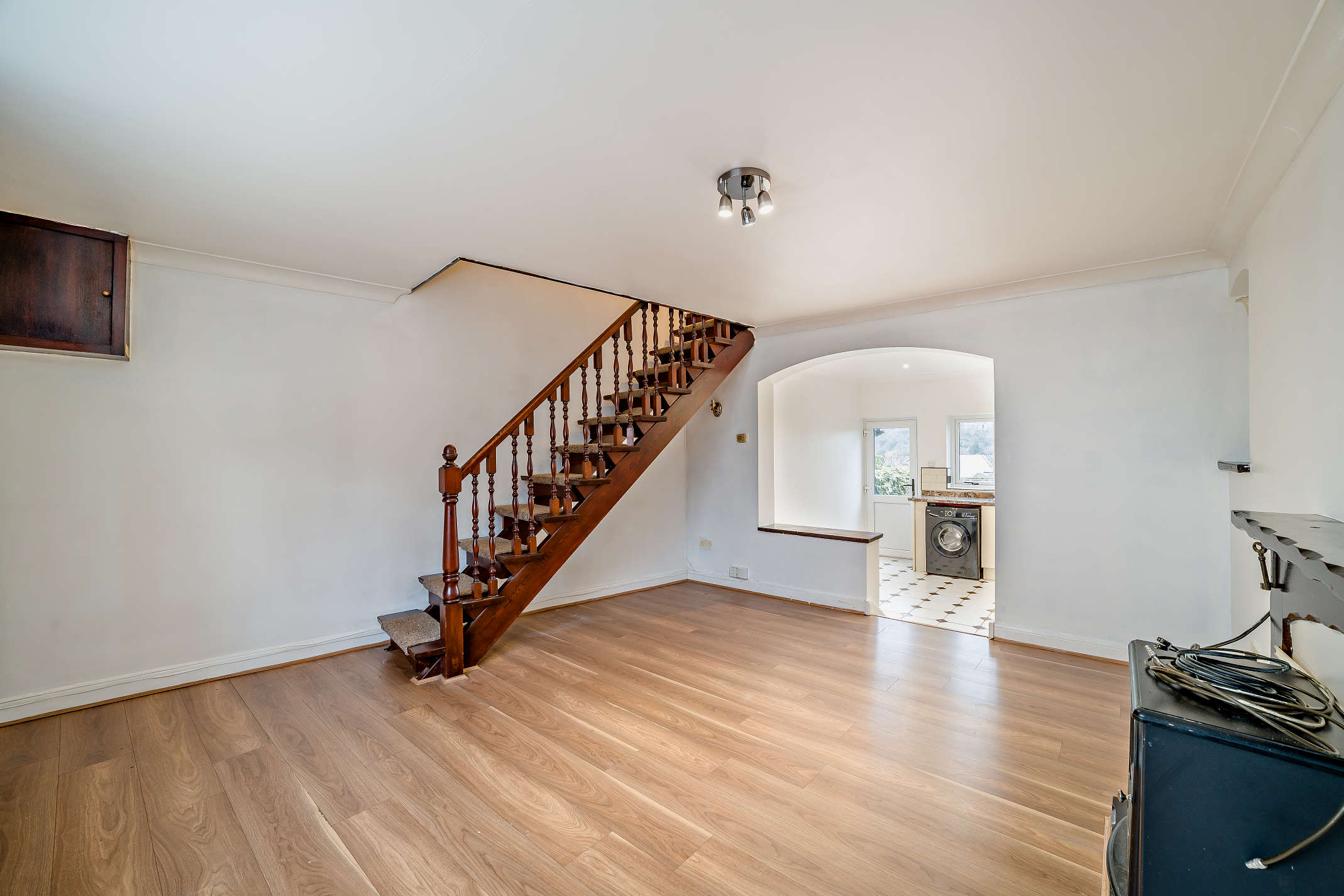 A spacious room with an electric fire, front aspect window, and laminated flooring. It flows into the step-down kitchen, divided by a low half-wall countertop.