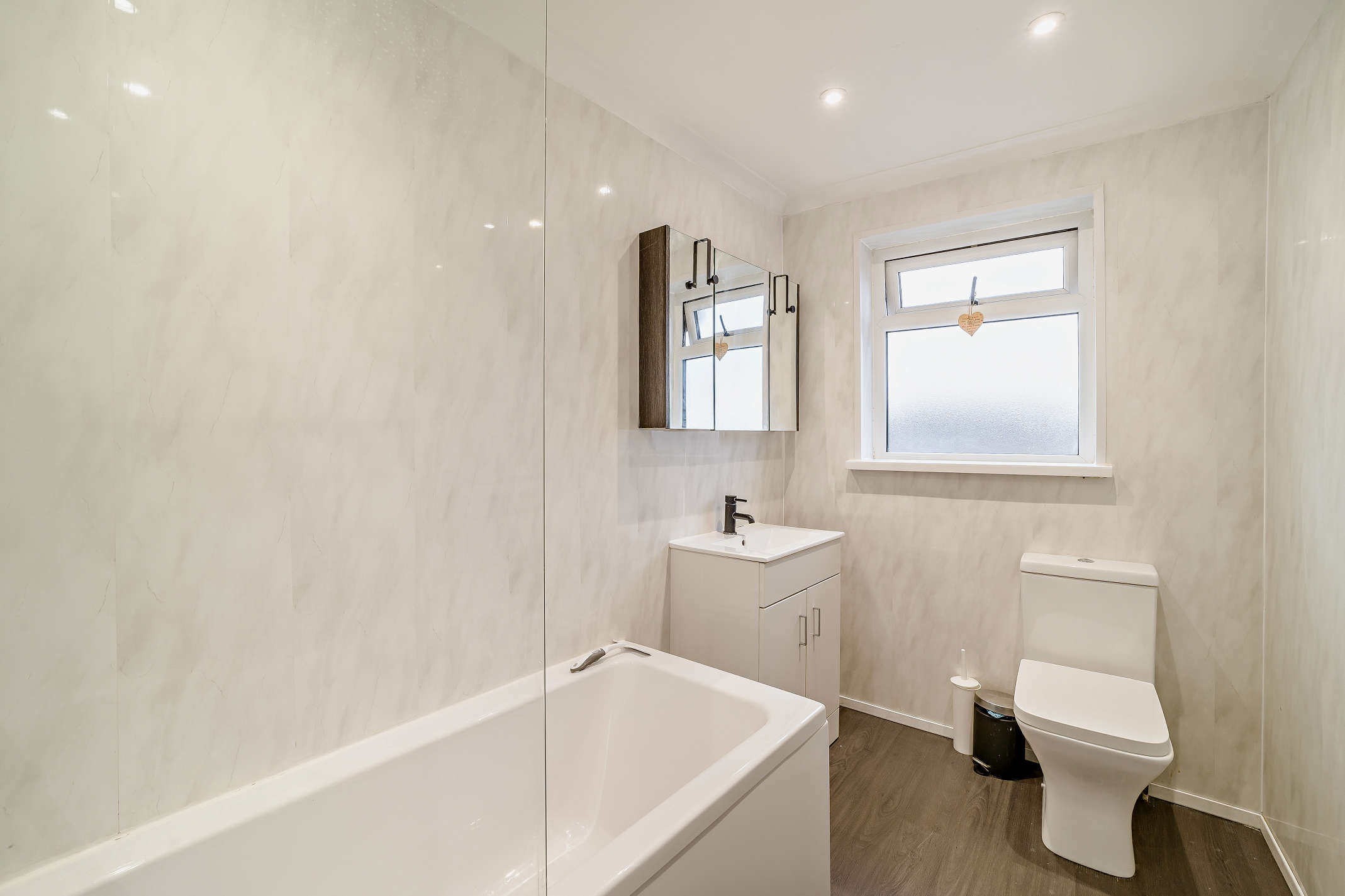 The bathroom is equipped with toilet, basin, and a bath.