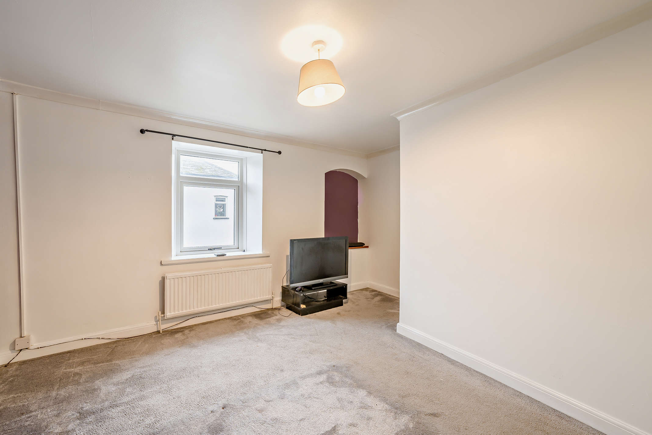 A single bedroom with rear window and carpeted flooring.