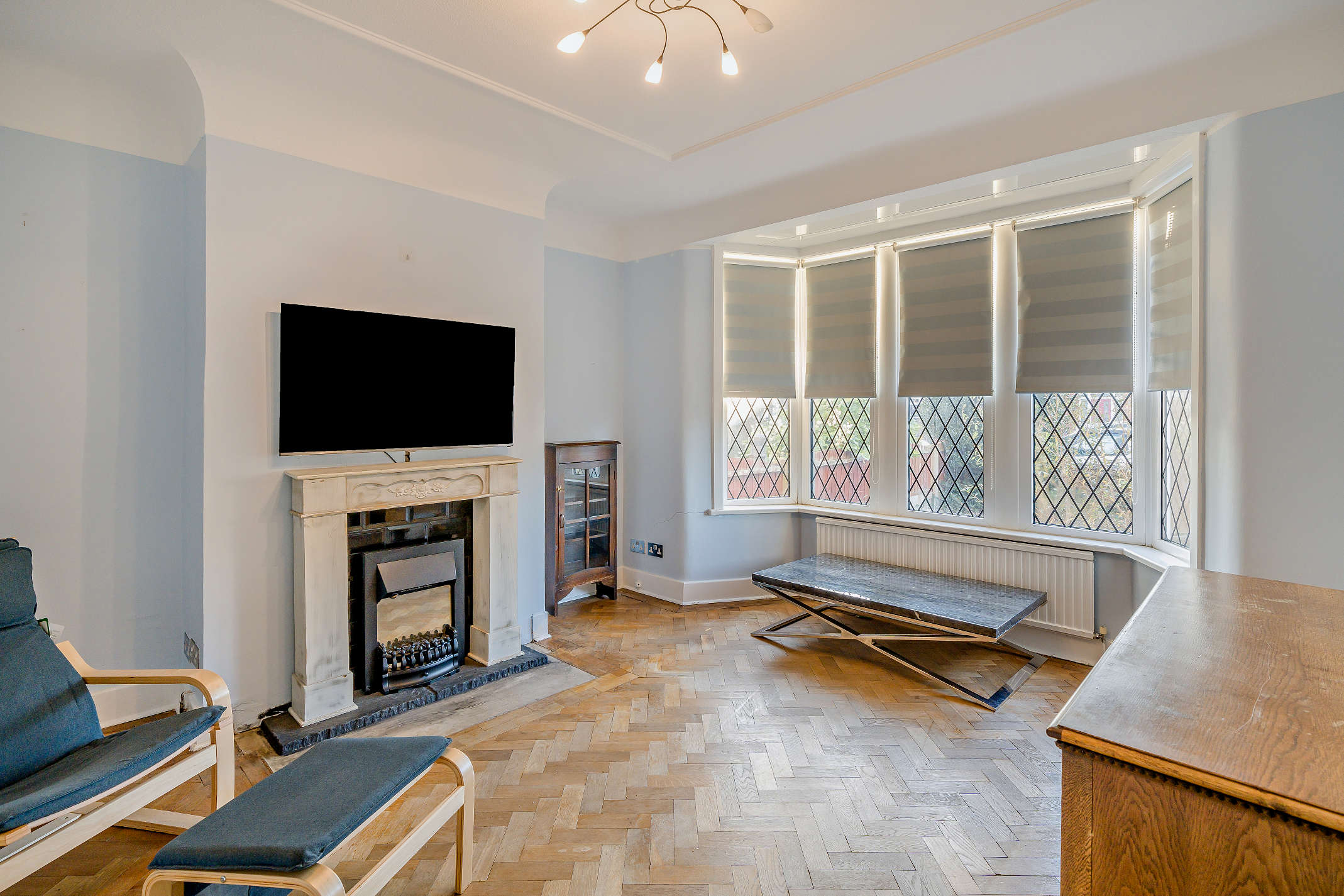 This spacious reception room is front facing with a bay window allowing for plentiful natural light. It offers a feature fireplace and parquet flooring throughout.