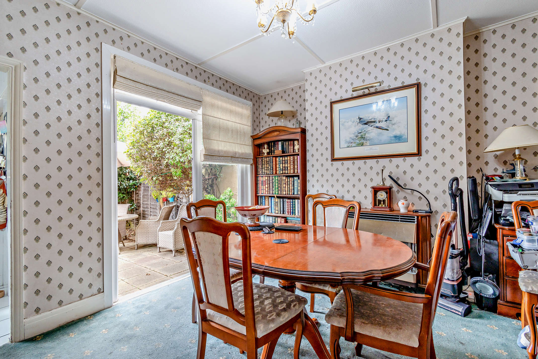 The dining room offers a built-in fireplace and carpeted flooring. From here the room leads to the kitchen and exits to the patio at the back through double French doors.