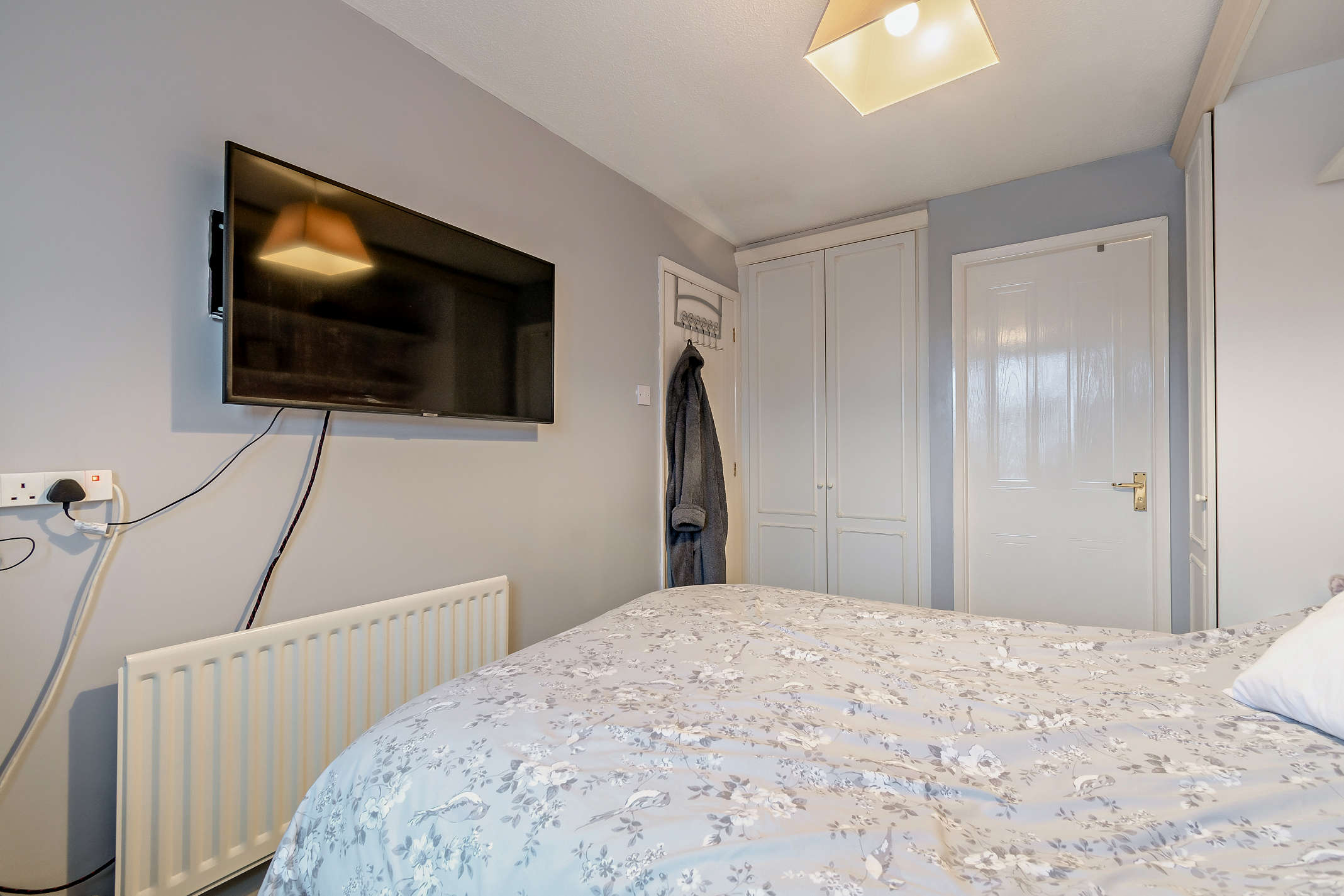 A double bedroom with a front aspect window, carpeted flooring built-in storage space and access to an en-suite shower room.