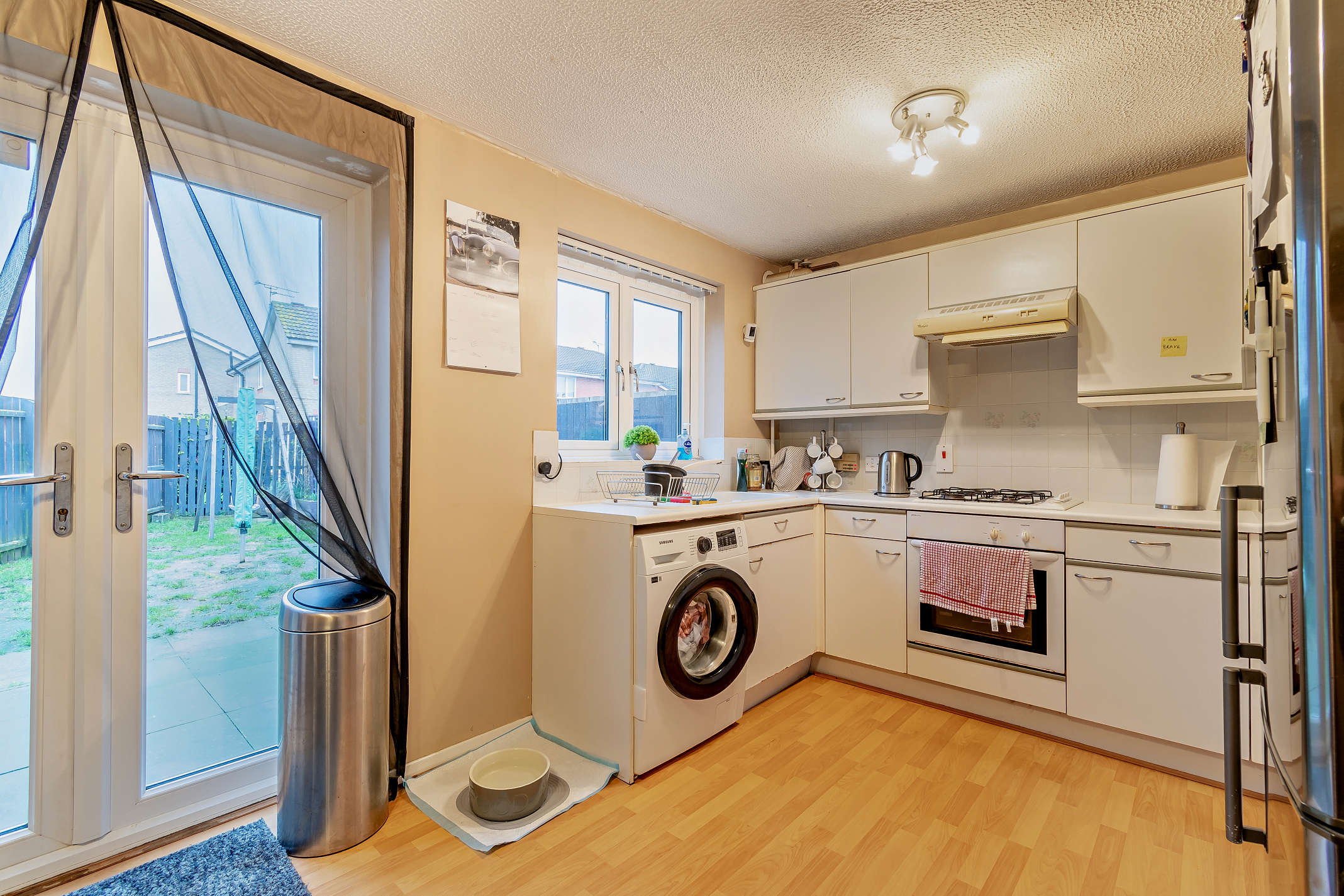 The kitchen is fitted with white storage cupboards and integrated appliances, including an oven, hob and extractor fan, while the dining area features double French doors opening onto the rear garden.