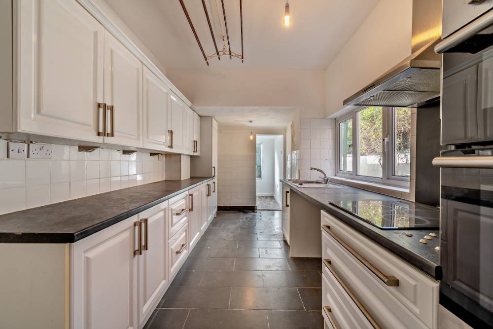 This is a generous kitchen with wall and base cabinets, coordinating worktops, floor and wall tiling. There are integrated appliances and space for under worktop appliances with in-built storage.