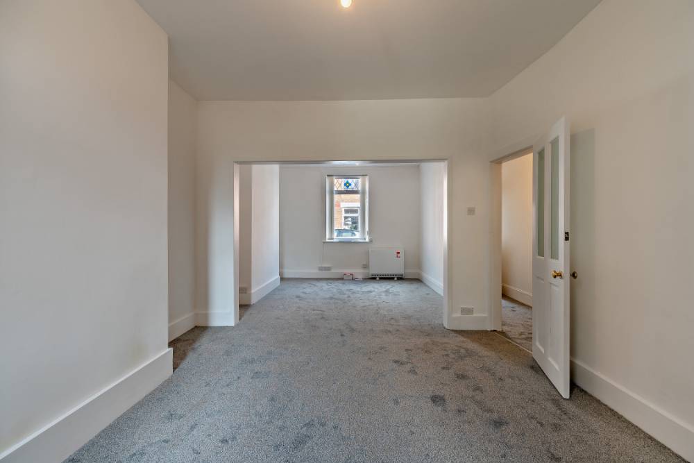 The second double bedroom is front-facing with neutral décor and carpeted flooring.
