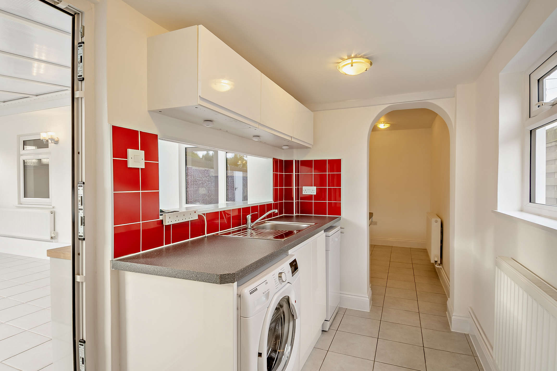 The kitchen is fitted with storage cupboards and built-in utilities, including a double oven, glass top hob and extractor fan. It also features splashback tiling, tiled flooring, a rear facing window and from here flows seamlessly to the utility.