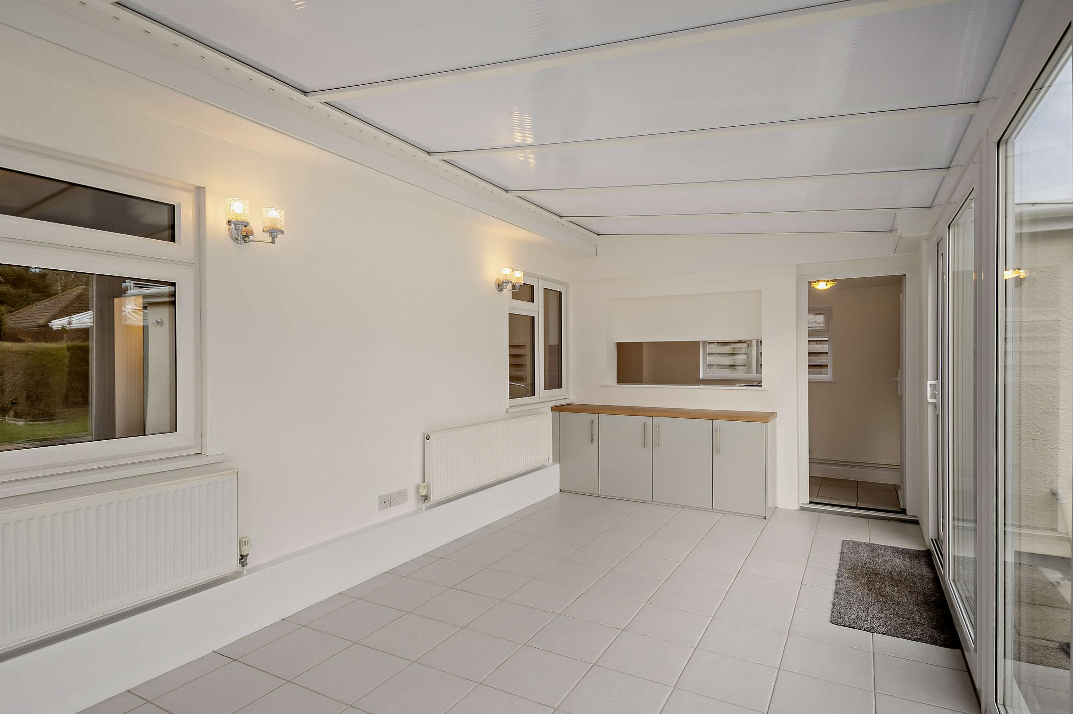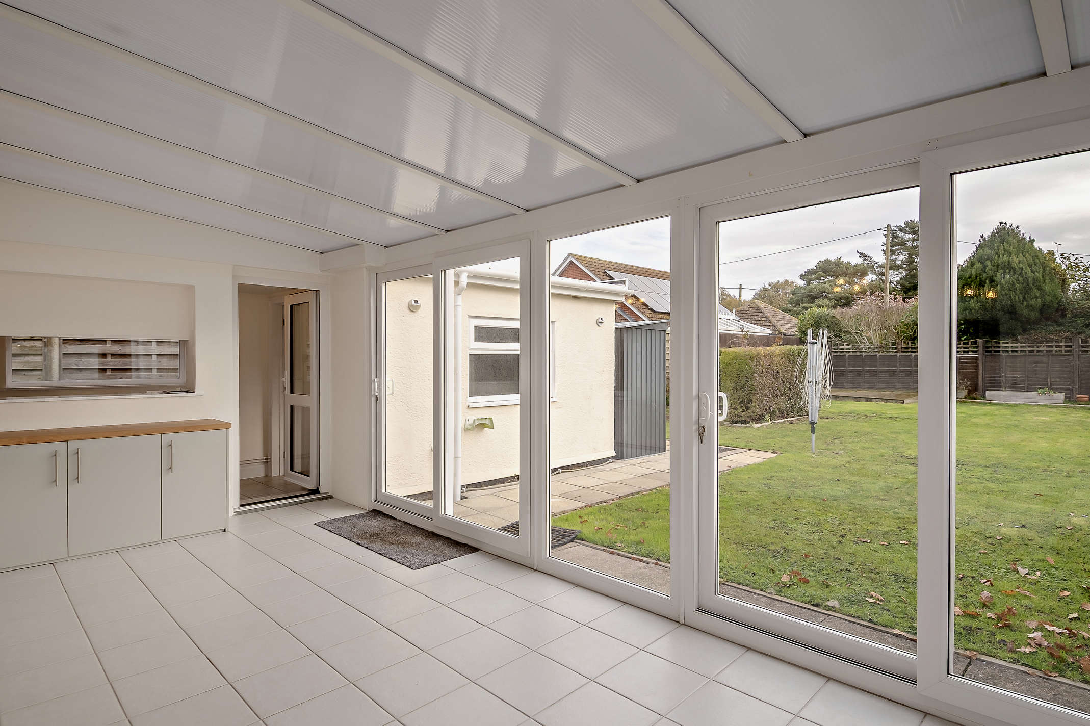 The spacious conservatory features storage cupboards, tiled flooring, and two glass sliding doors that open up to the rear garden. The room also includes side wall highlight windows.