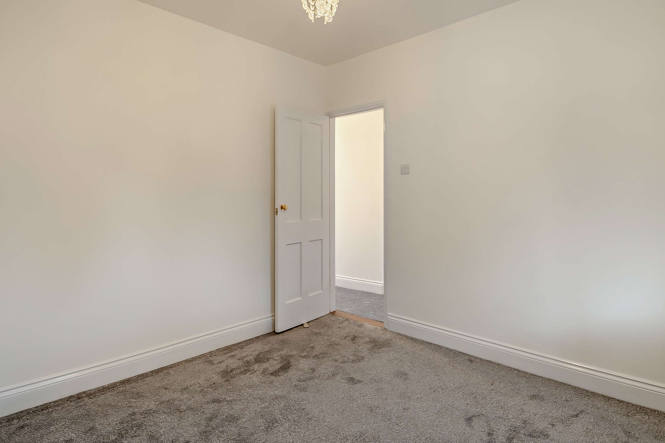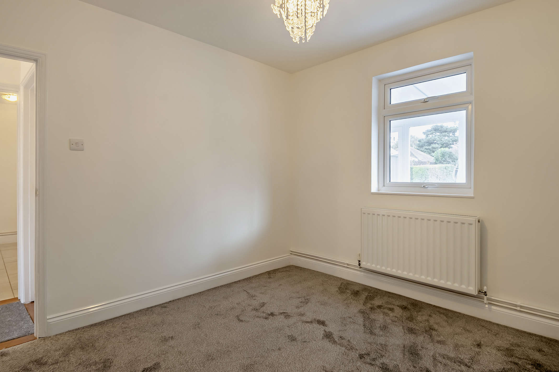This double bedroom features a window with internal views to the conservatory and carpeted flooring.