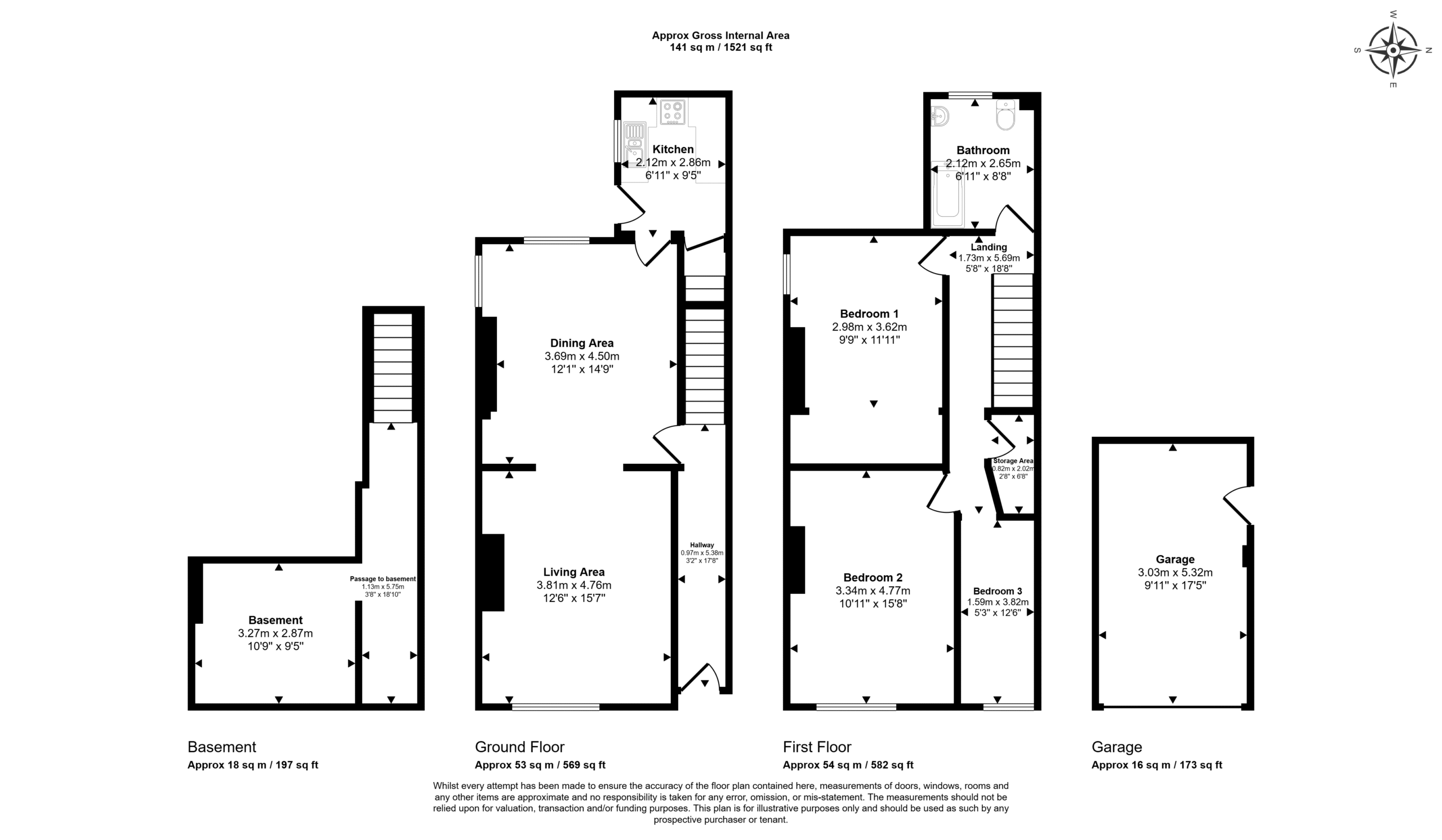 The accommodation spans three levels, including a basement offering additional storage. The ground floor features a welcoming living room, a separate dining area, and a fitted kitchen.