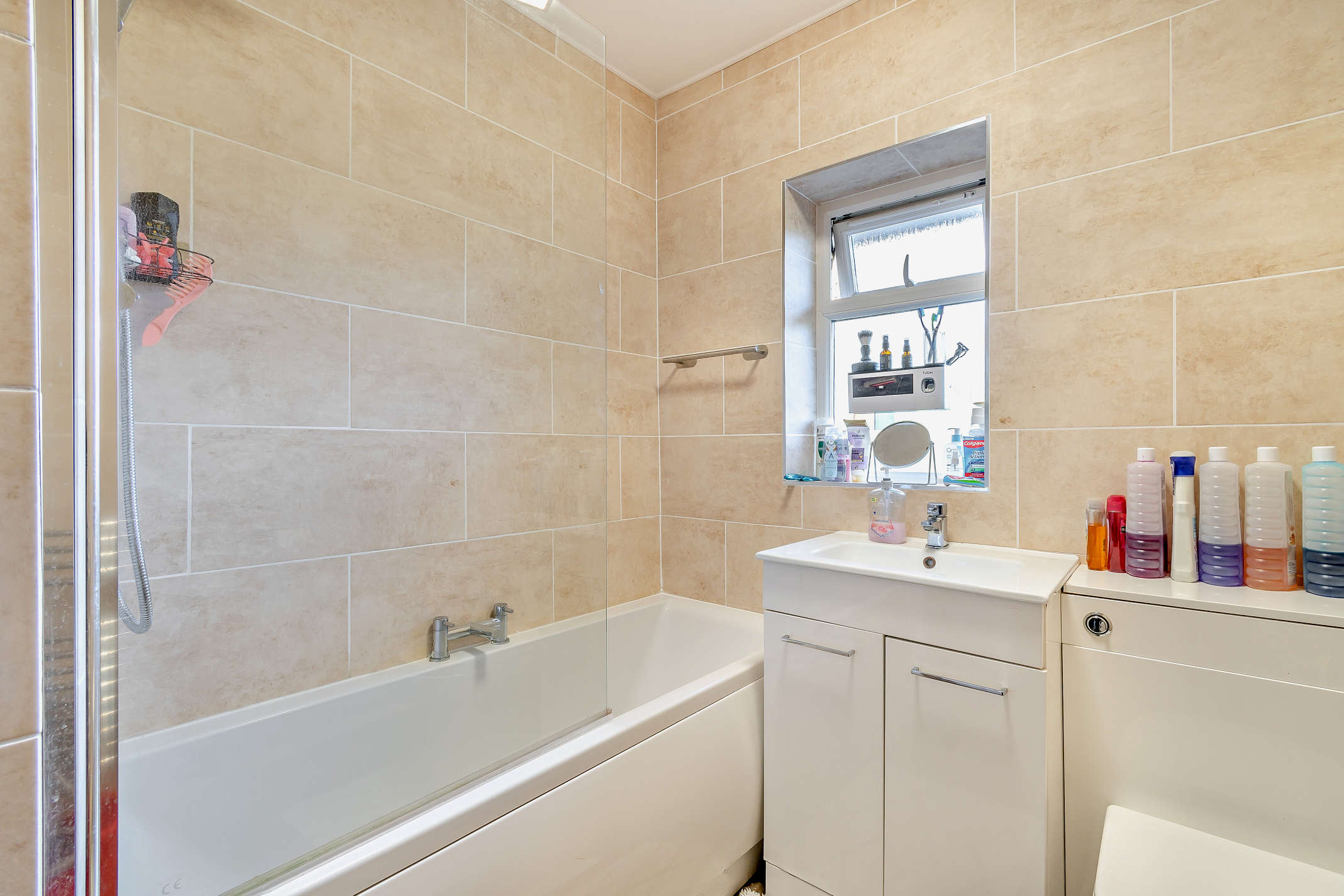 The bathroom is equipped with toilet, hand wash basin in cabinet and a bath with an overhead shower.