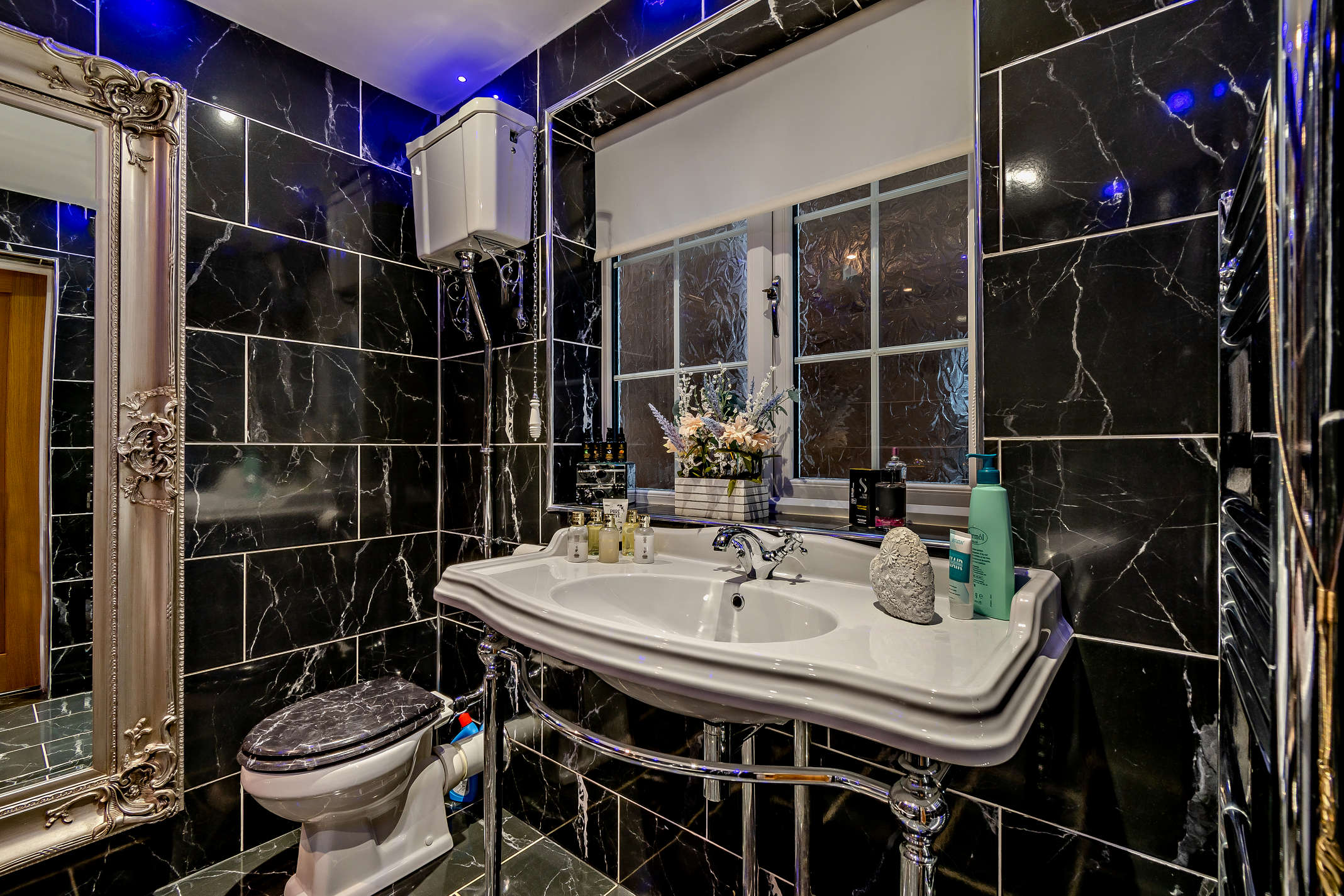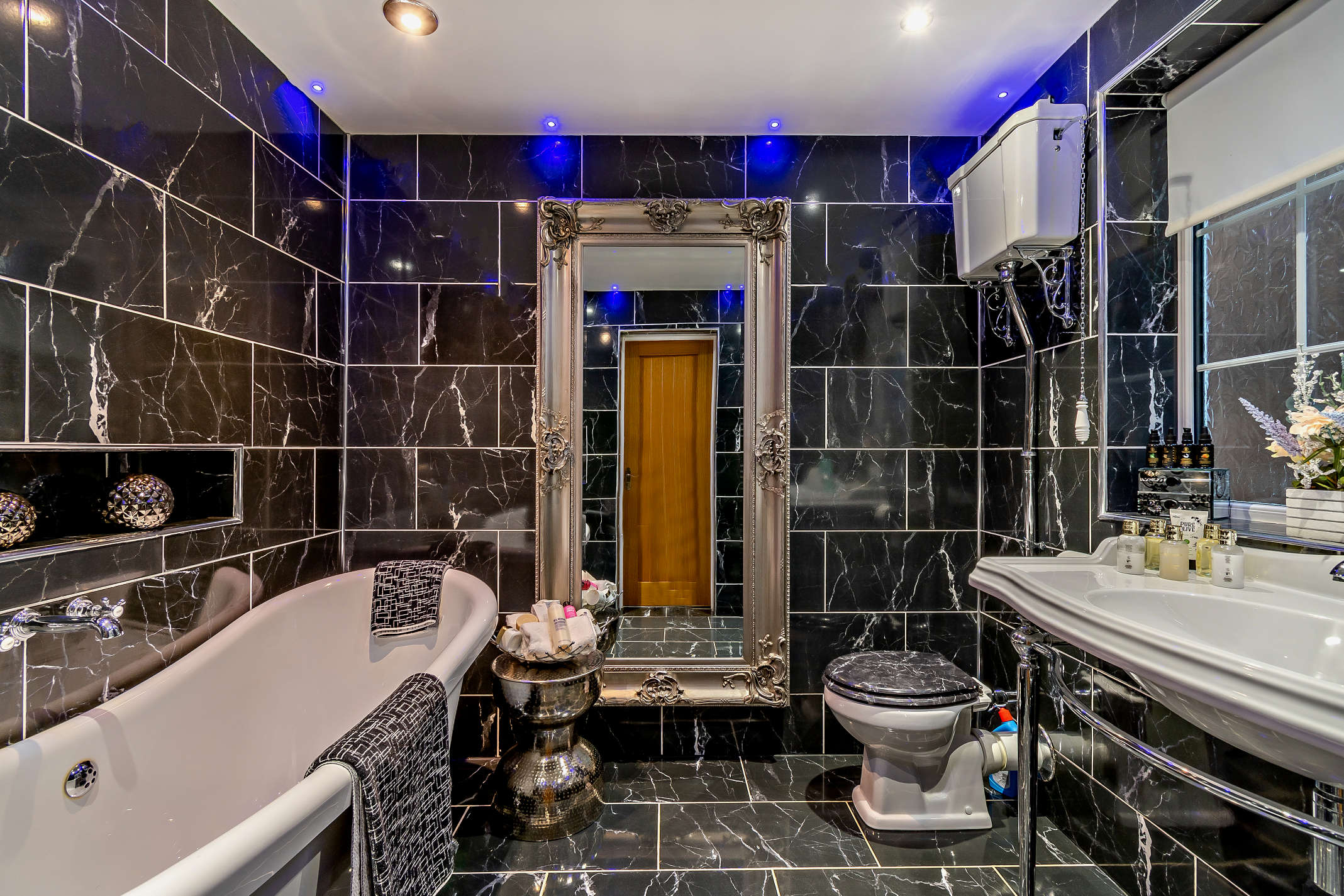 The luxurious en suite comprises a white three-piece bathroom suite with a free-standing, roll top bath with period washbasin and WC to co-ordinate.