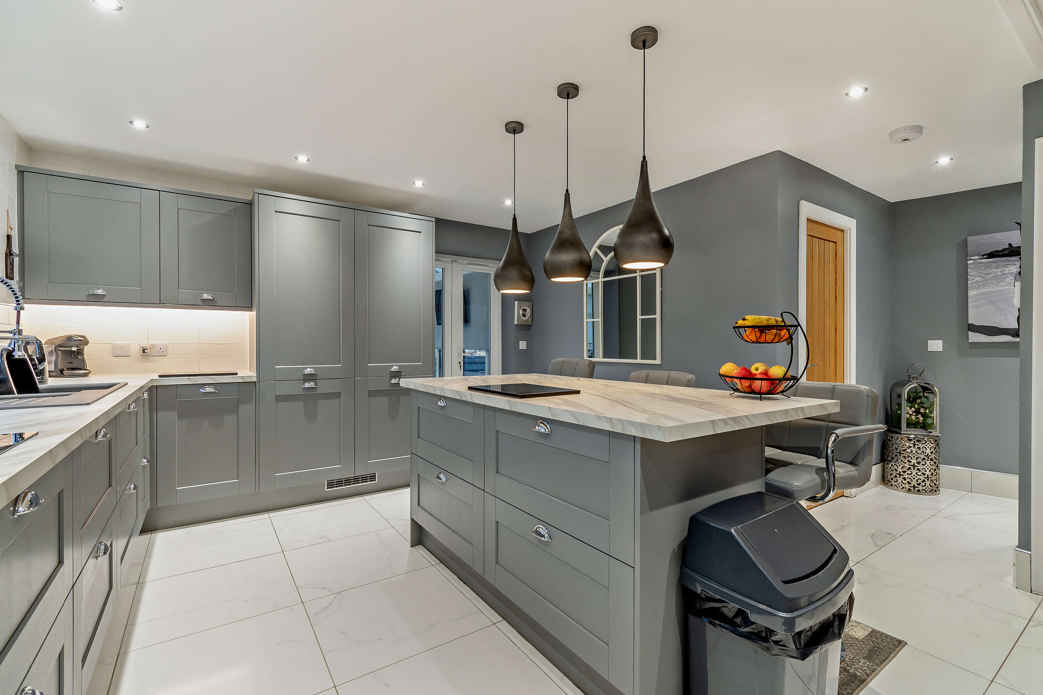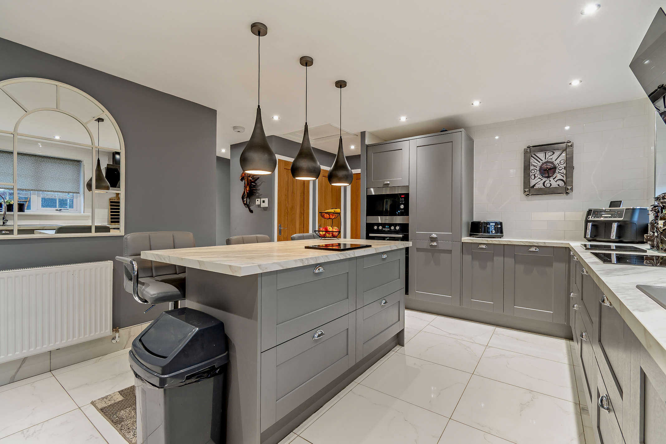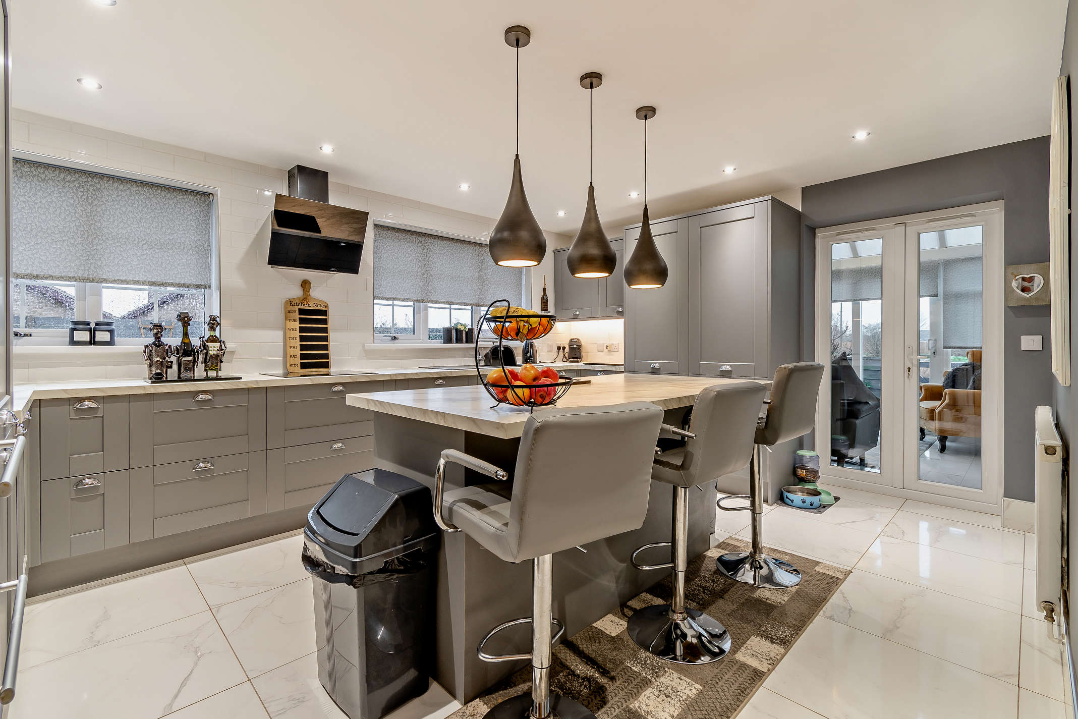 This is a large, open-plan area with a feature island breakfast bar with focus lighting above, in-built storage and Shaker-style wall, drawer and base cabinets with integrated appliances. There are marble worktops with tiled flooring to co-ordinate and double doors open to the conservatory from the kitchen.
