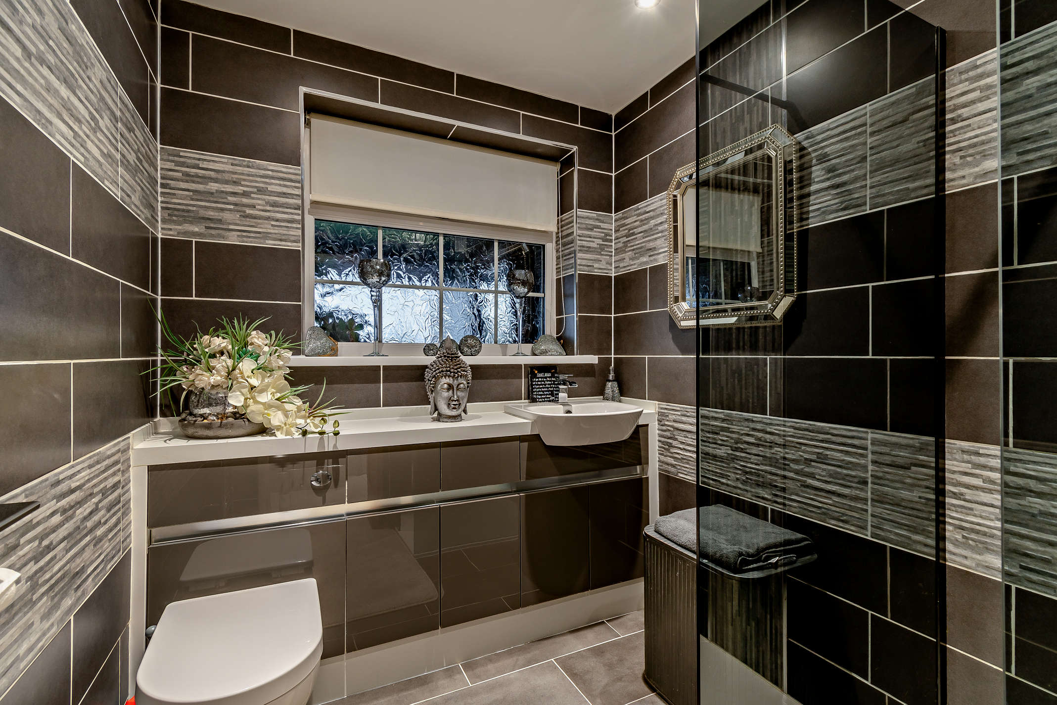 The tiled shower room comprises a walk-in shower enclosure with dual shower head, white vanity washbasin with integrated storage, a WC and chrome ladder radiator.