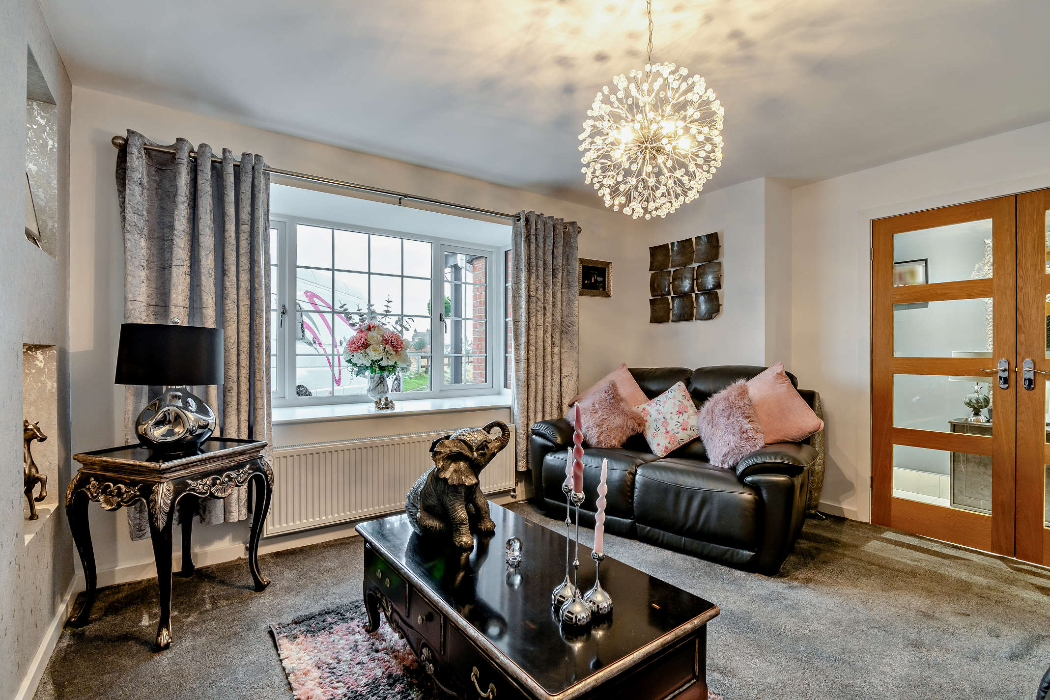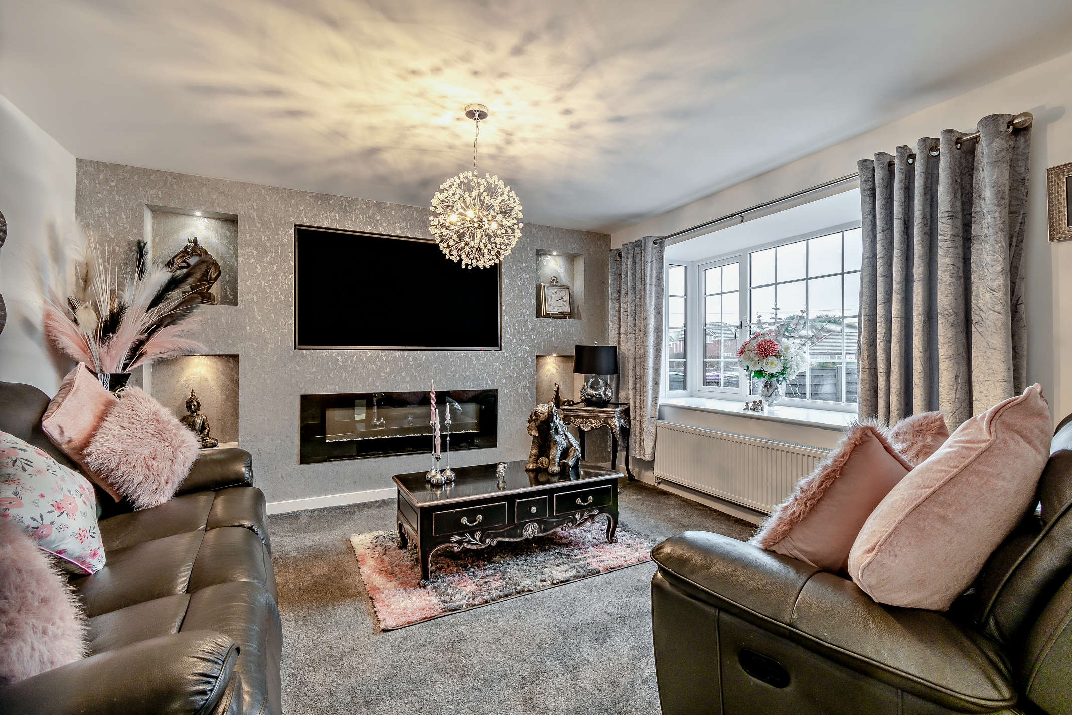 The carpeted lounge is spacious with a feature fireplace, display wall niches to the alcoves, bay window front aspect view and double doors opening to the entrance hall.