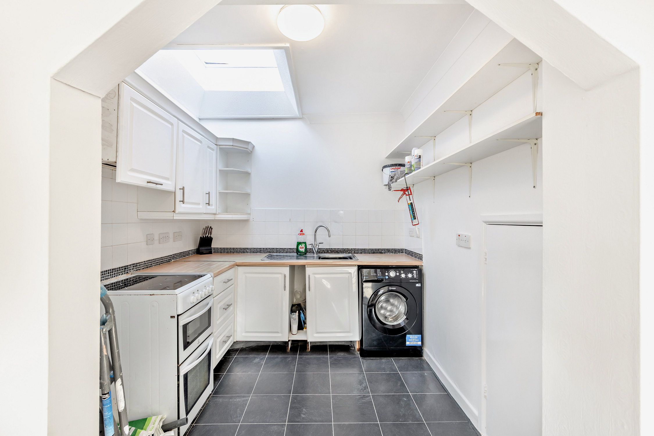 The kitchen features a range of wall and base cabinets with display shelving and space for under-counter appliances. A roof lantern provides abundant natural light.