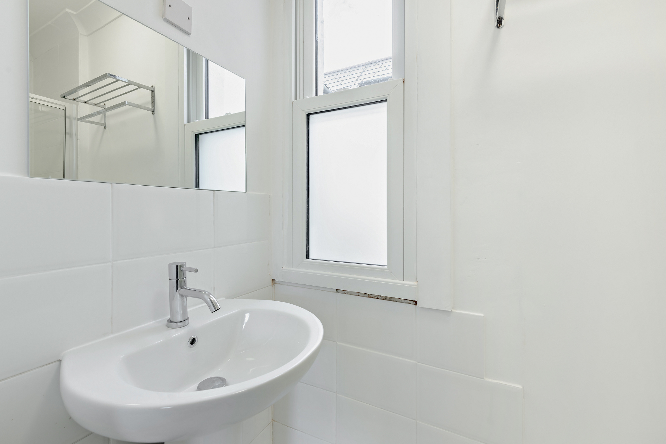 The modern en suite offers a walk-in shower enclosure with white washbasin.
