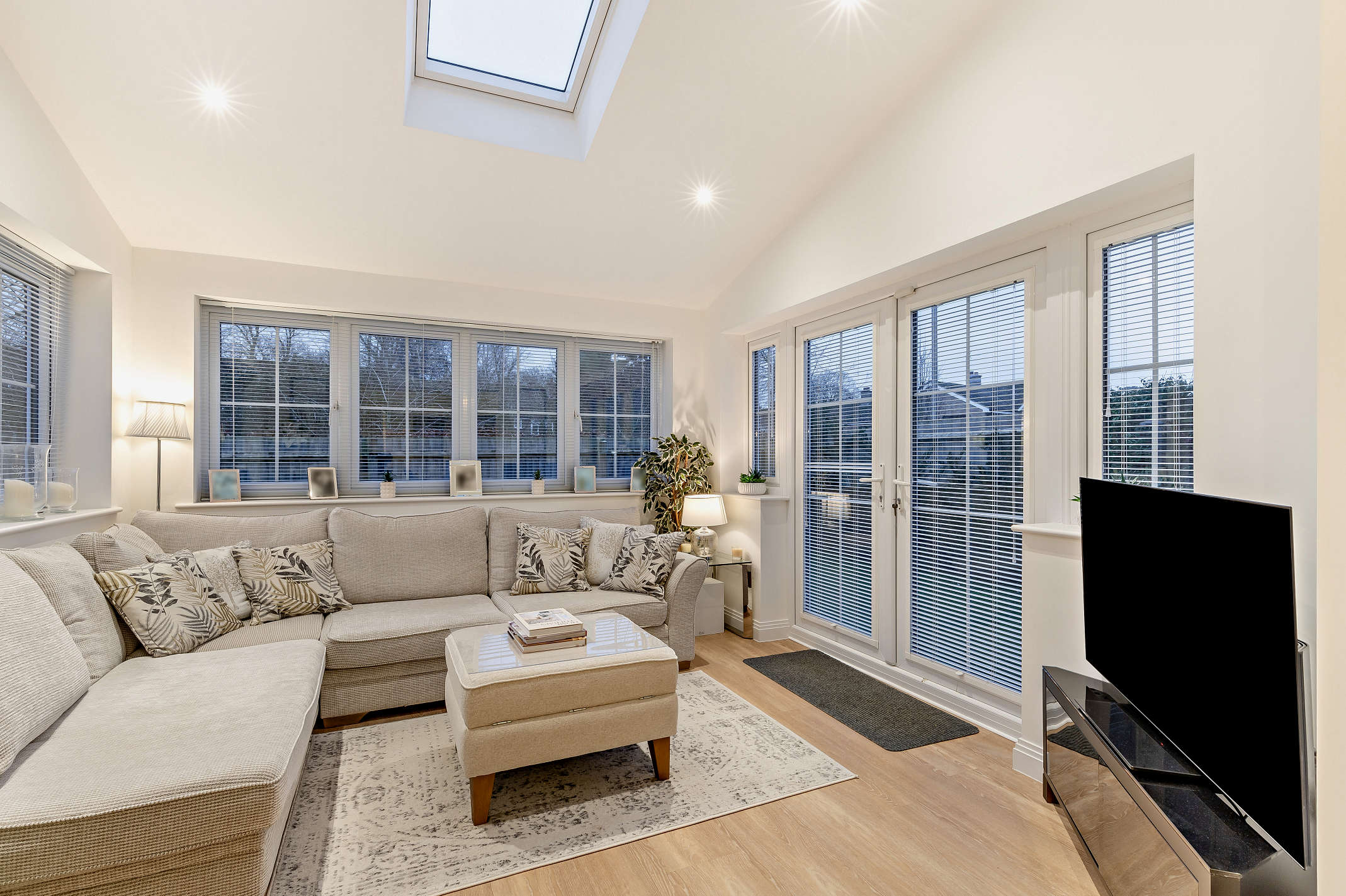 The sun room features laminated flooring, rear aspect windows and double French doors to the back garden.
