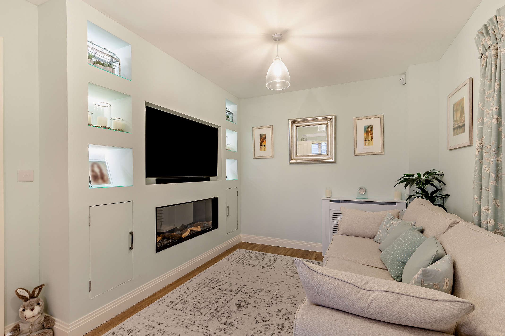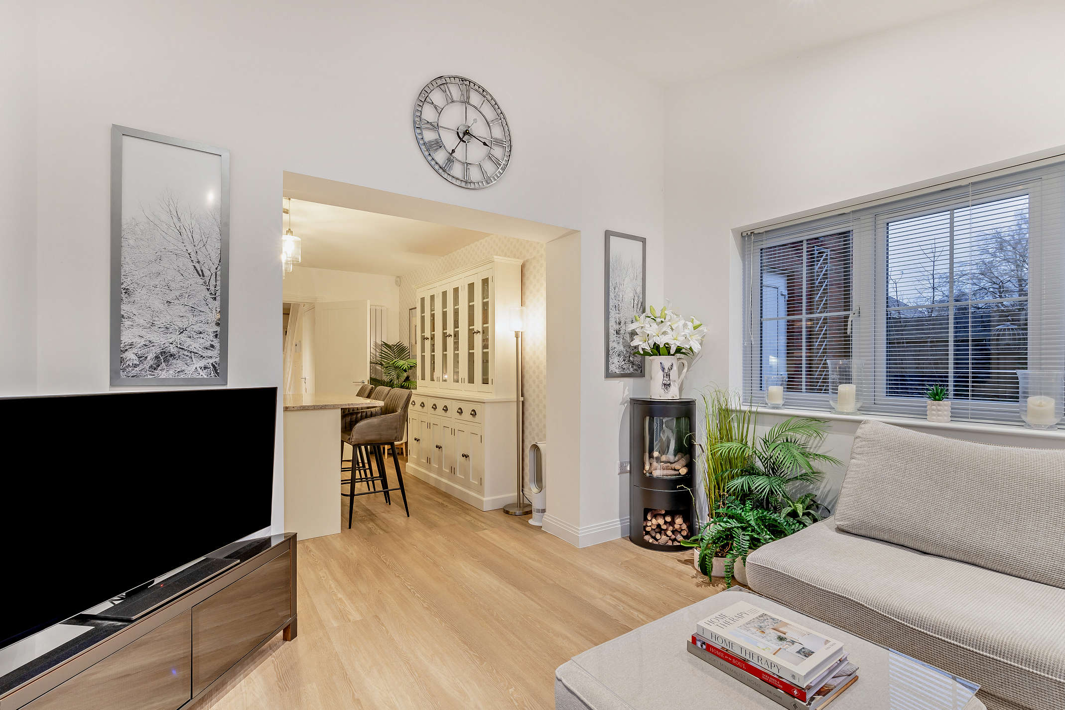 The well-spaced living room has a front aspect box bay window, a side facing window, laminated flooring and built-in storage space.