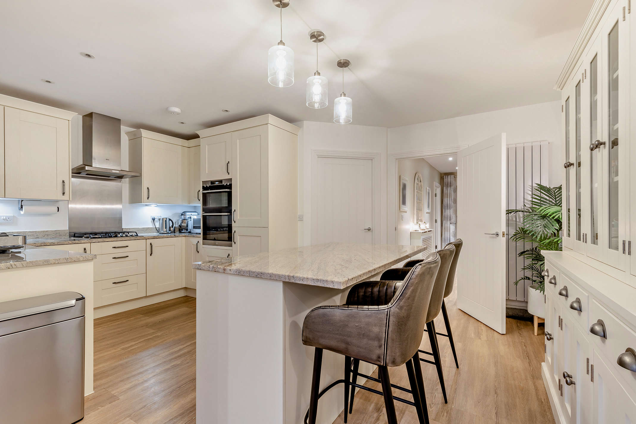 The modern kitchen is fitted with storage cupboards and built-in utilities, including a double eye level oven, gas hob and extractor hood.