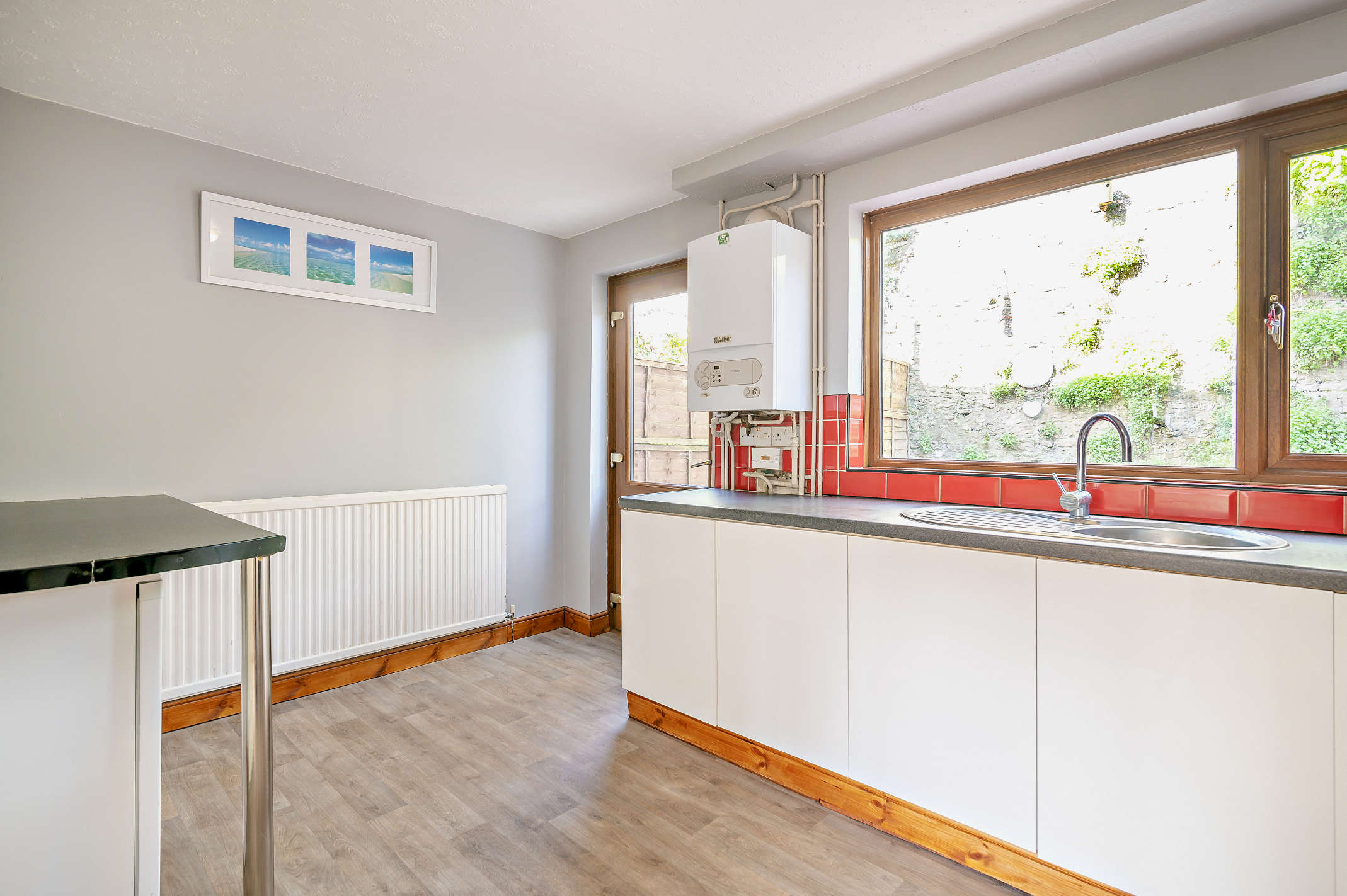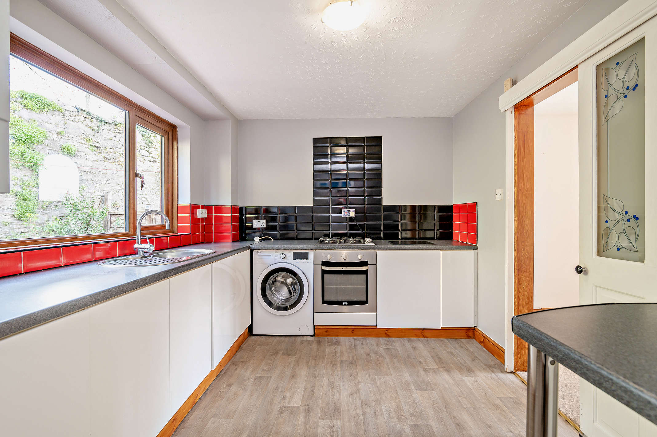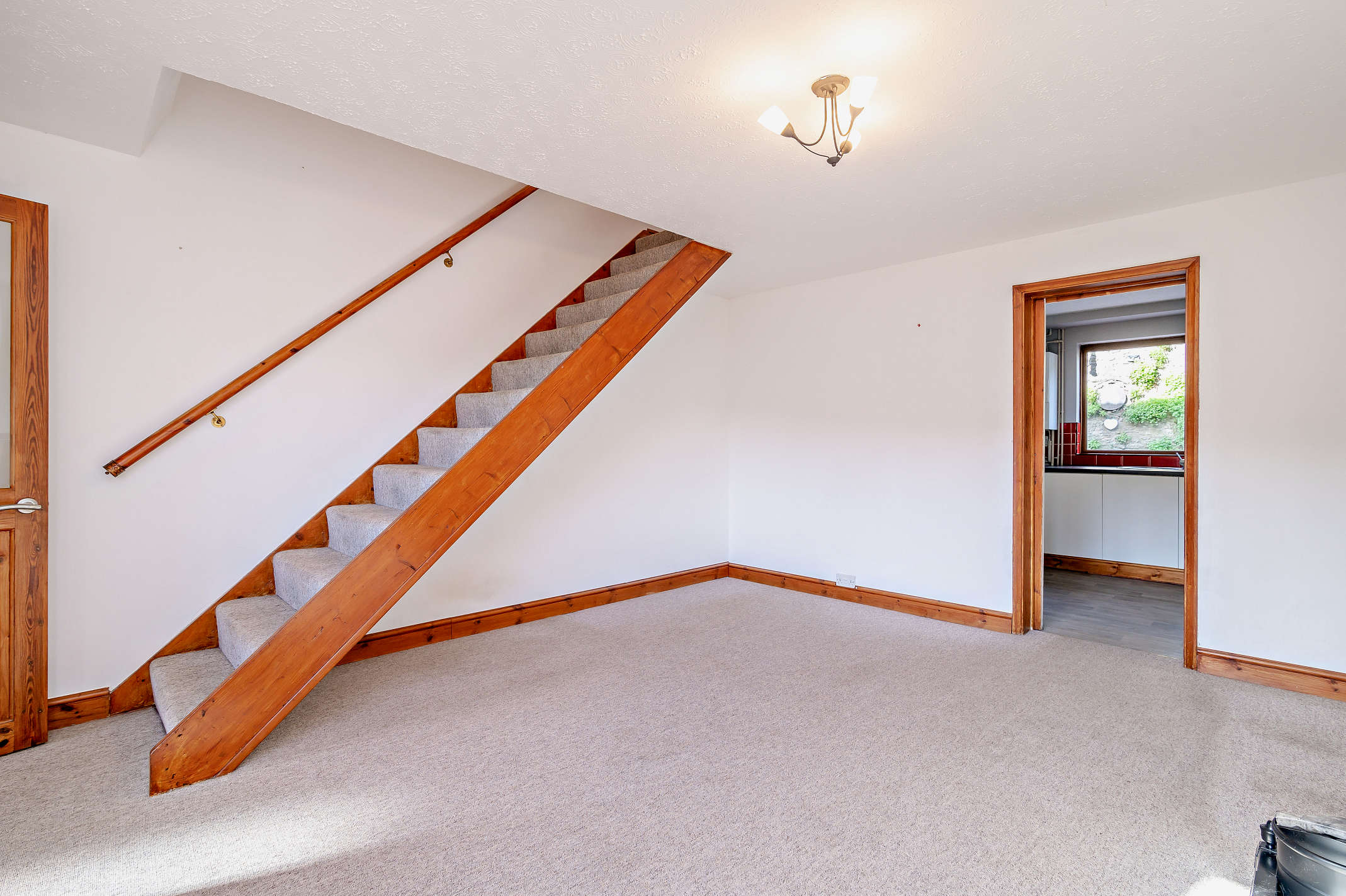 The ground floor comprises a welcoming porch entrance leading into a bright living room, which flows seamlessly into a kitchen/dining area at the rear. The kitchen provides direct access to the garden, creating a practical and sociable layout suited to modern living.