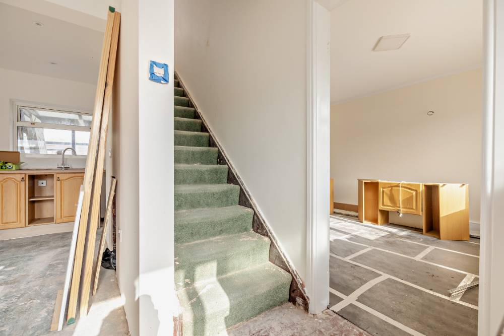 This is a large space with some base cabinets in situ. The light-filled kitchen offers sufficient room for a breakfast/dining table and, from the kitchen, a carpeted staircase rises to the first floor.