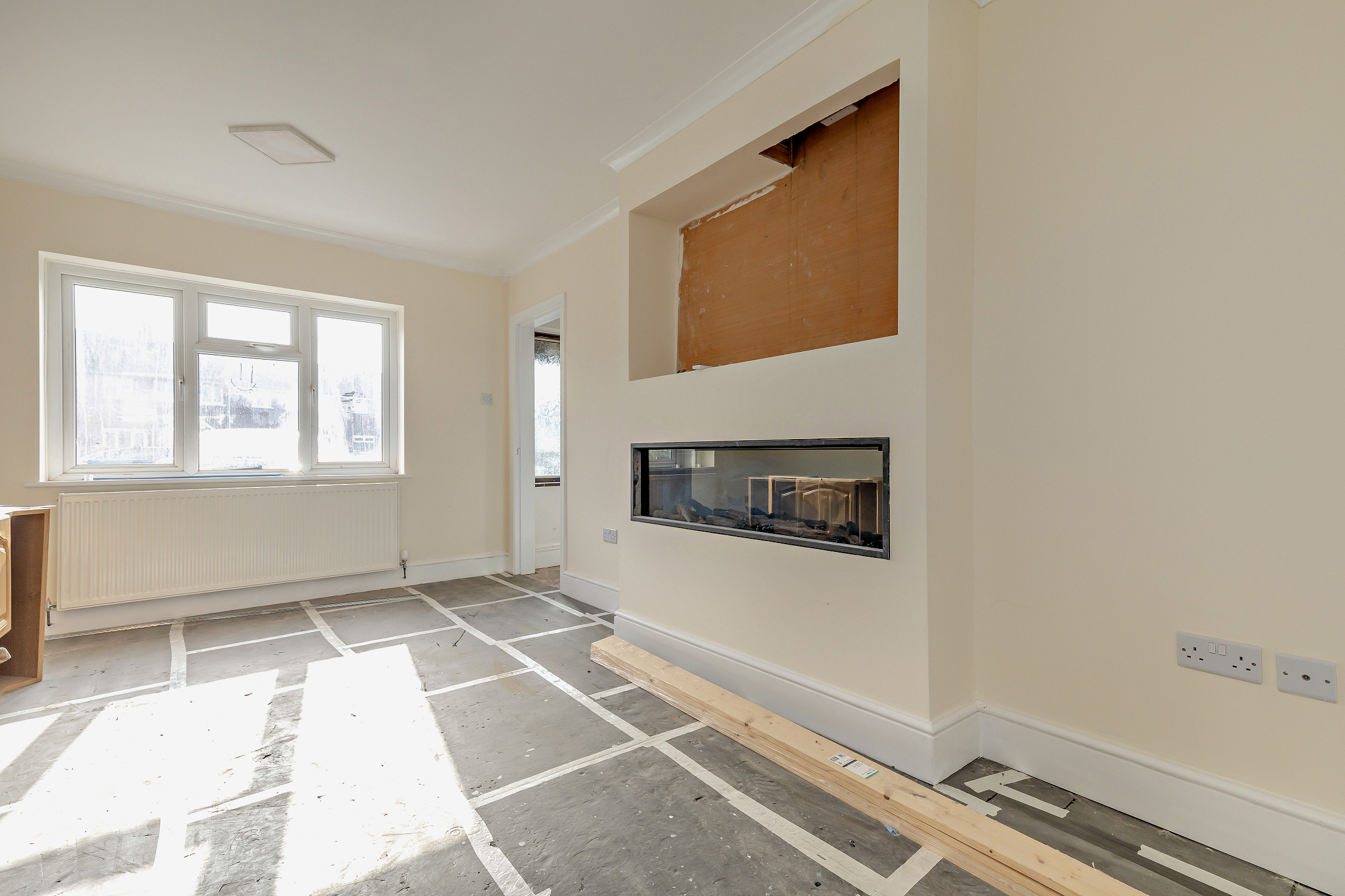 This is a large space with some base cabinets in situ. The light-filled kitchen offers sufficient room for a breakfast/dining table and, from the kitchen, a carpeted staircase rises to the first floor.