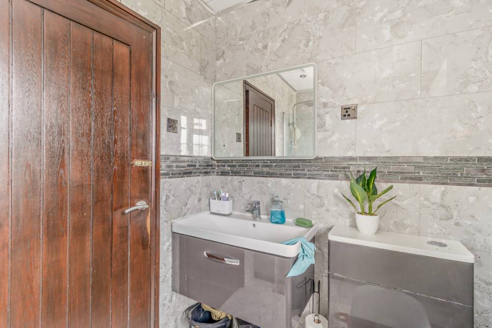 The bathroom is fully-tiled with a stylish marble-effect finish and is equipped with a toilet, wash hand basin with vanity unit and bath facilities.