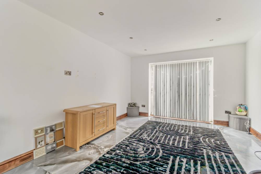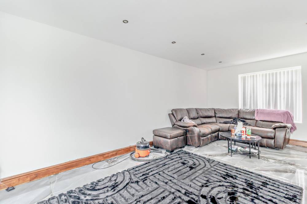 The spacious lounge features modern spot lighting and marble-effect floor tiling, with a large window to the front providing the room with ample natural light. From here there is sliding door access to the extension at the rear.