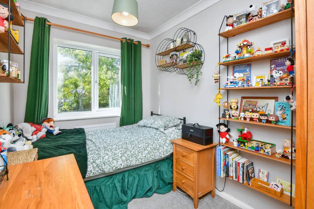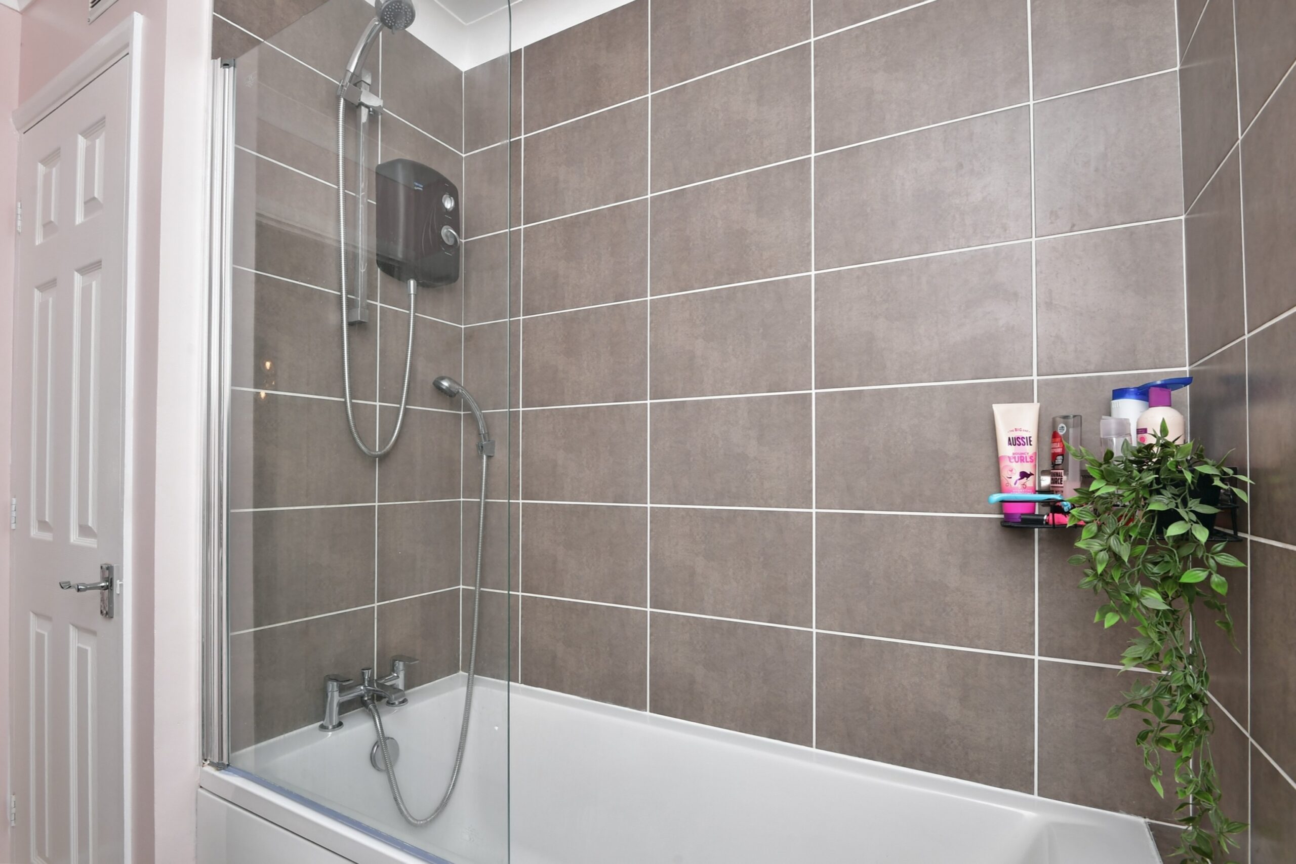 Upstairs, the master bedroom provides a peaceful retreat with its built-in storage, complemented by a second bedroom that’s perfect for guests, a nursery, or an office. The family bathroom gives a modern feel with a clean, contemporary suite featuring a bath with overhead shower, toilet, and basin.