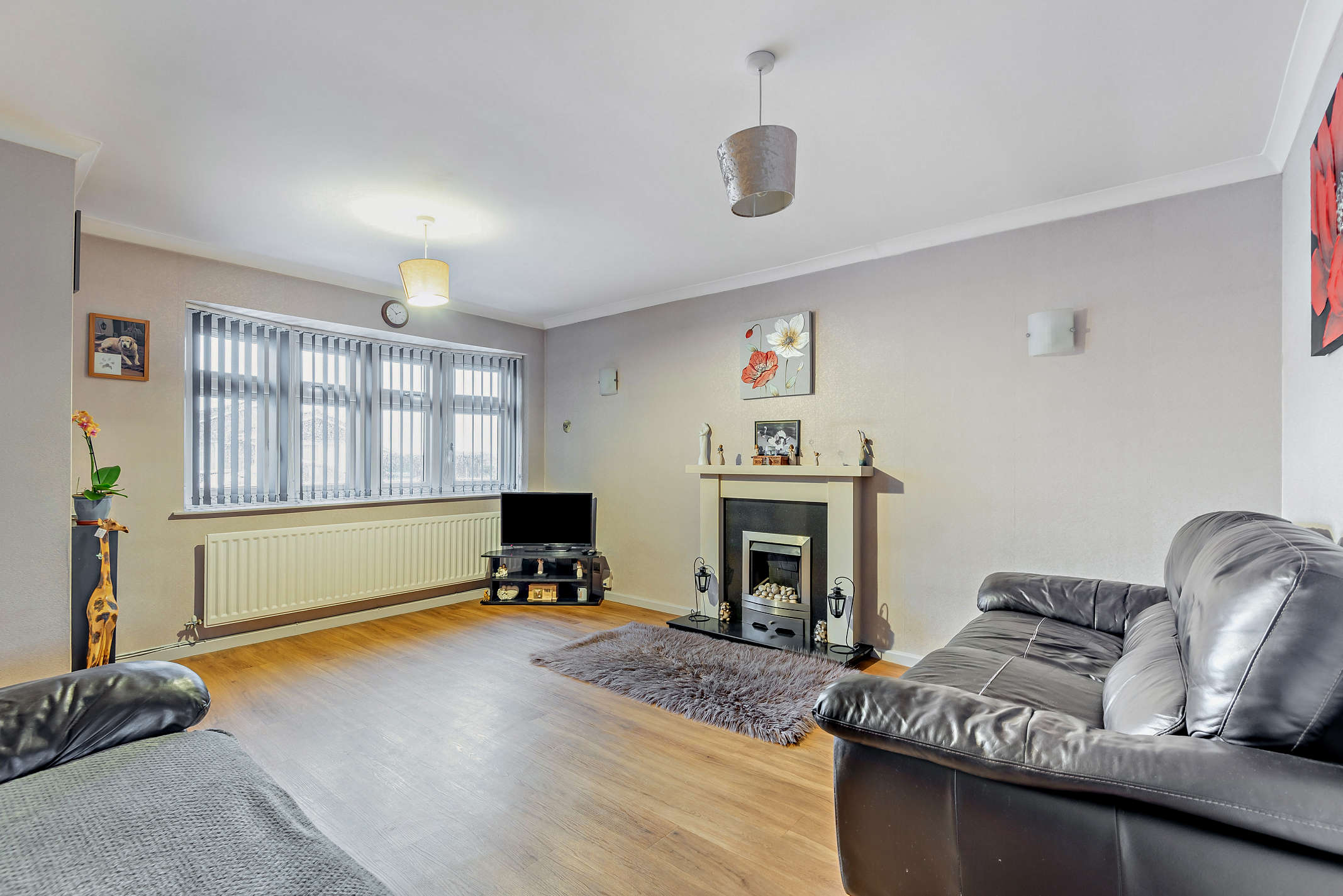 The spacious living room features a built-in fireplace, a front aspect bay window and laminated flooring.