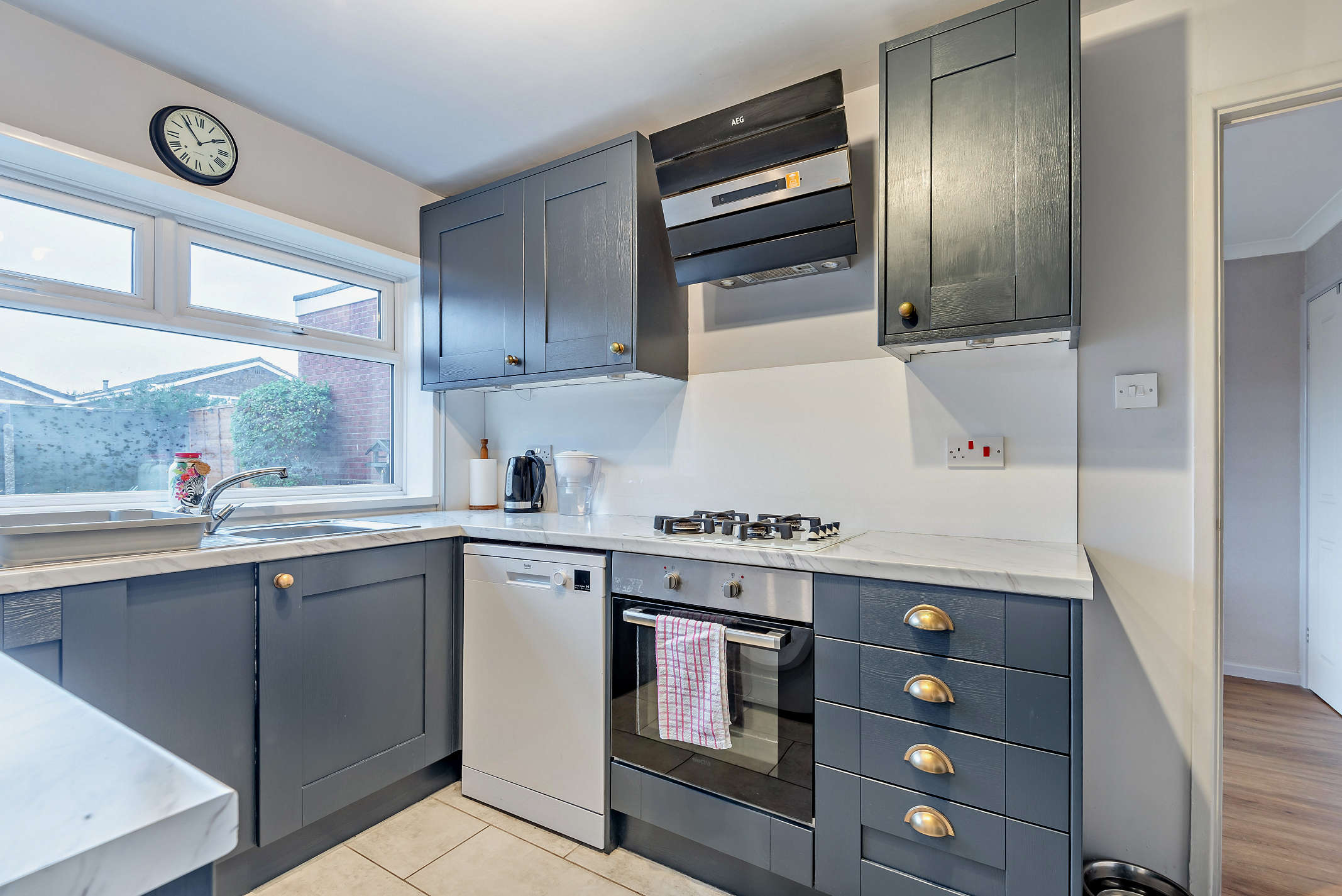 The kitchen is fitted with storage cupboards and built-in utilities, including an oven, hob and extractor fan.