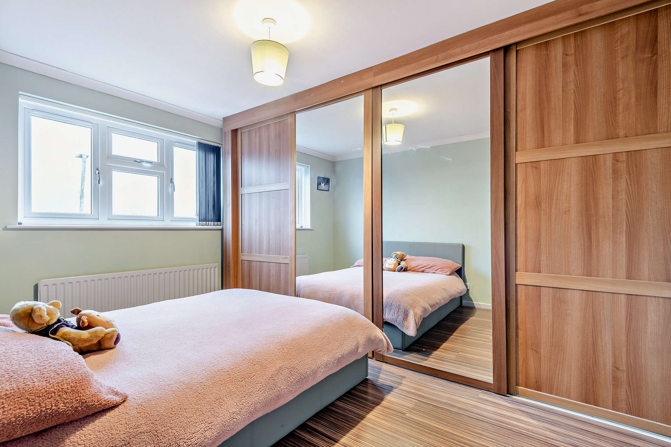 This double bedroom features a window with front views, laminated flooring and built in storage space.