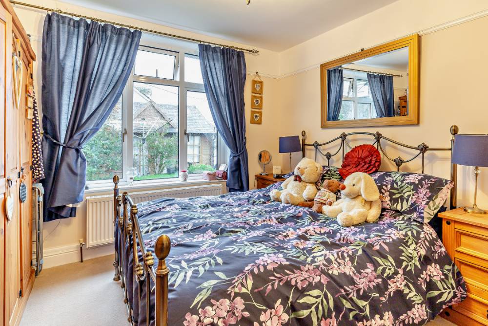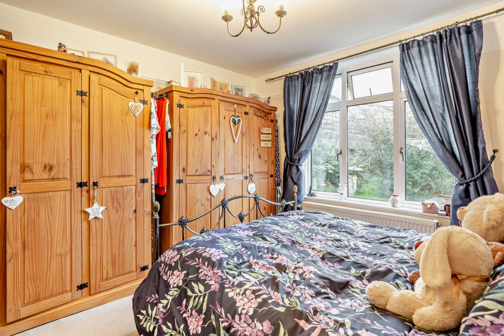 This double bedroom features a window with views to the back garden and carpeted flooring.